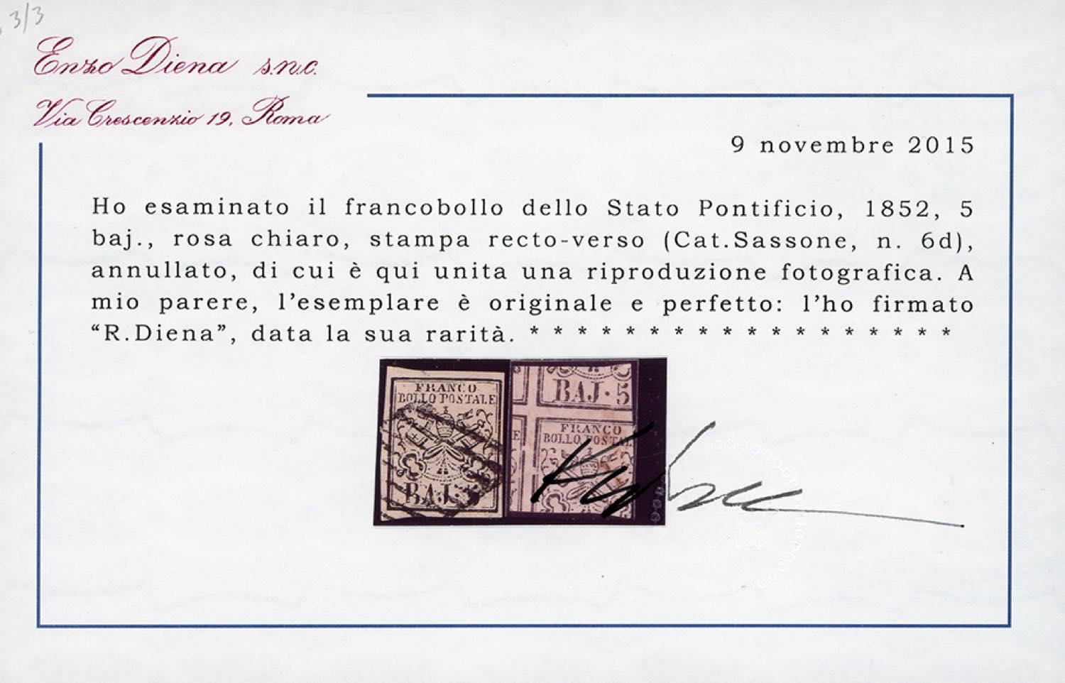 1852 - 5 baj rosa chiaro, stampa recto-verso (6d), usato, ottimo stato, lievissima piega, certificato come perfetto. Cert. Diena.