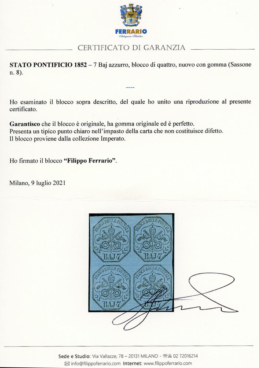 1852 - 7 baj azzurro (8), blocco di quattro, gomma originale, perfetto (presenta un tipico punto chiaro nell'impasto della carta, che non ... Read more