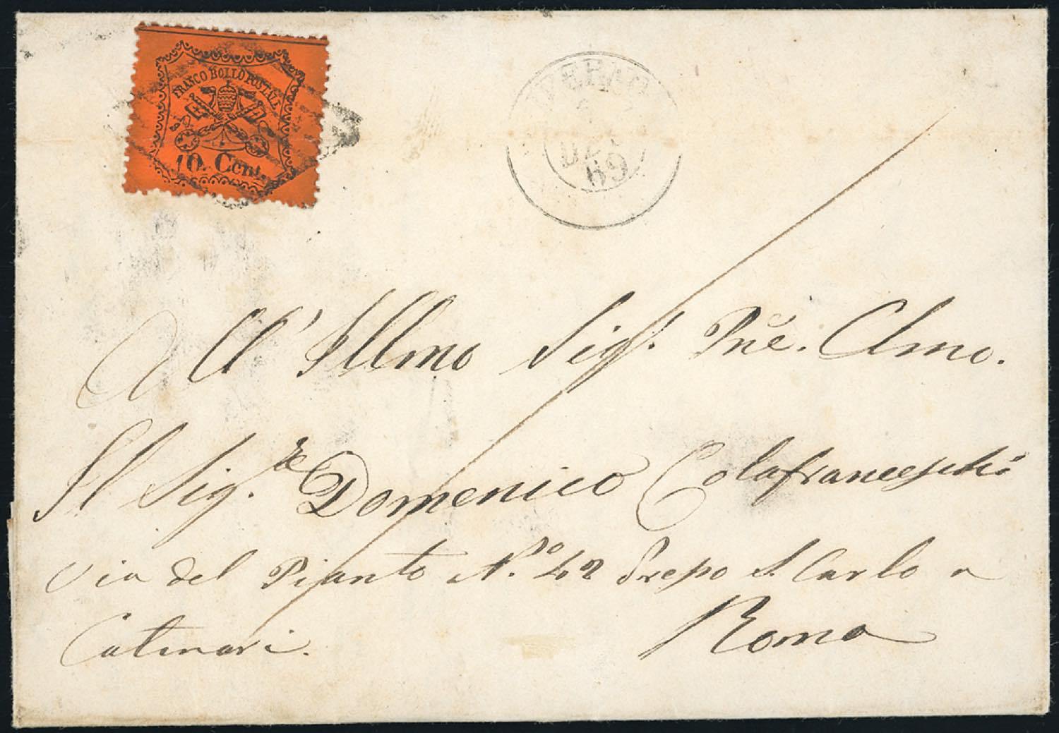 ROCCAGORGA, SI punti R1 - 10 cent. (26), lieve piega orizzontale, su lettera del 6/12/1869 per Roma. Raro annullo, ben impresso e lettera di ottimo aspetto. Cert. Bottacchi.