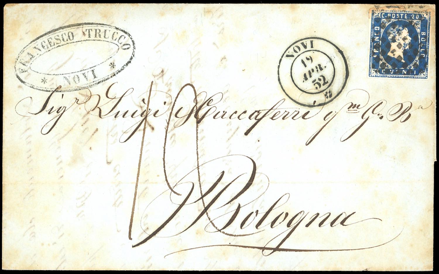 1852 - 20 cent. azzurro (2), ossidazioni sul bordo superiore, su lettera da Novi 19/4/1852 a Bologna, affrancata fino al confine e tassata ... Read more