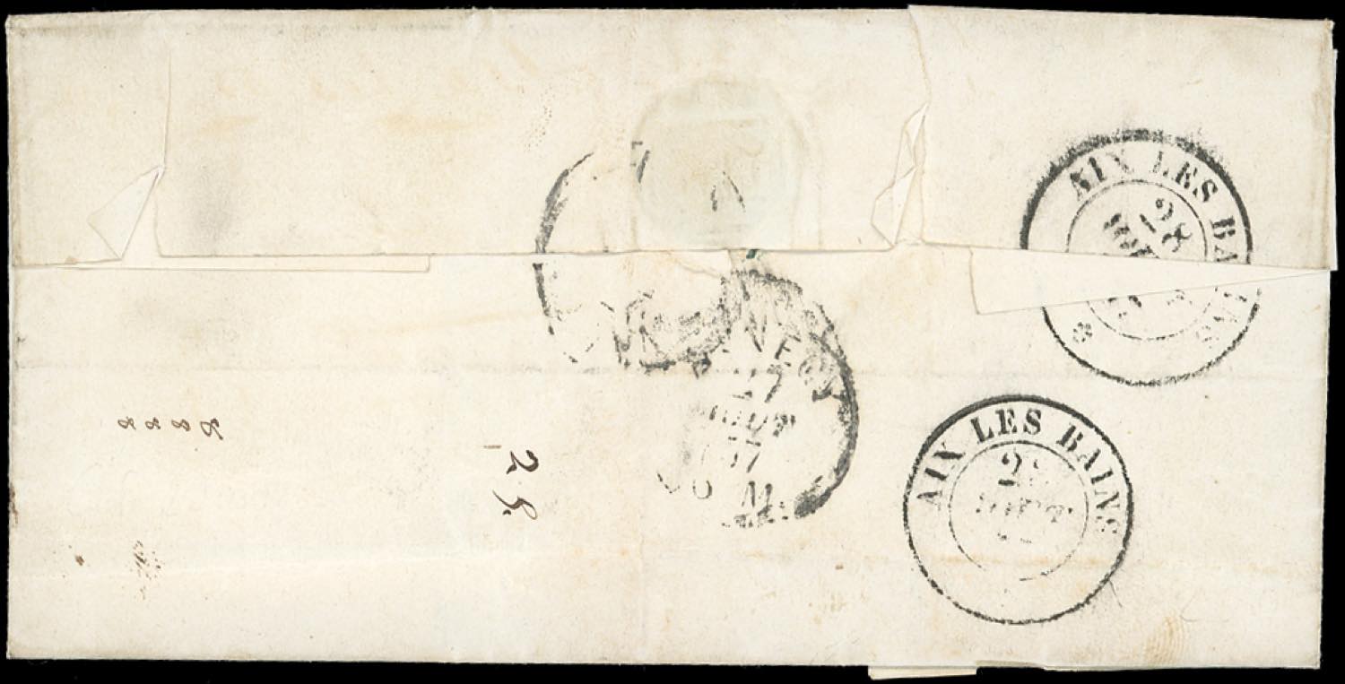1857 - 5 cent. verde mirto scuro (13Ab), due coppie, difetti, su lettera da Bonneville 26/8/1857 ad Annecy, rispedita ad Aix Les Bains. ... Read more