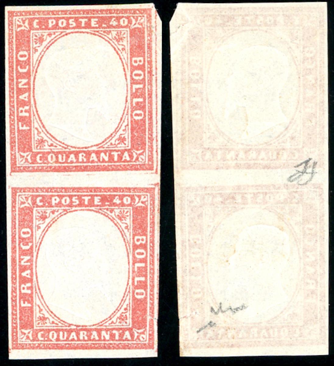 1863 - 40 cent. rosa vermiglio (16F), coppia verticale di due esemplari normali, con una terza effigie al centro, gomma originale, impercettibile traccia di linguella, il primo esemplare leggermente difettoso in un angolo. Rarissima varietà, non catalogata per questo valore. Chiavarello, Ex coll. Imperato. Cert. Ferrario.