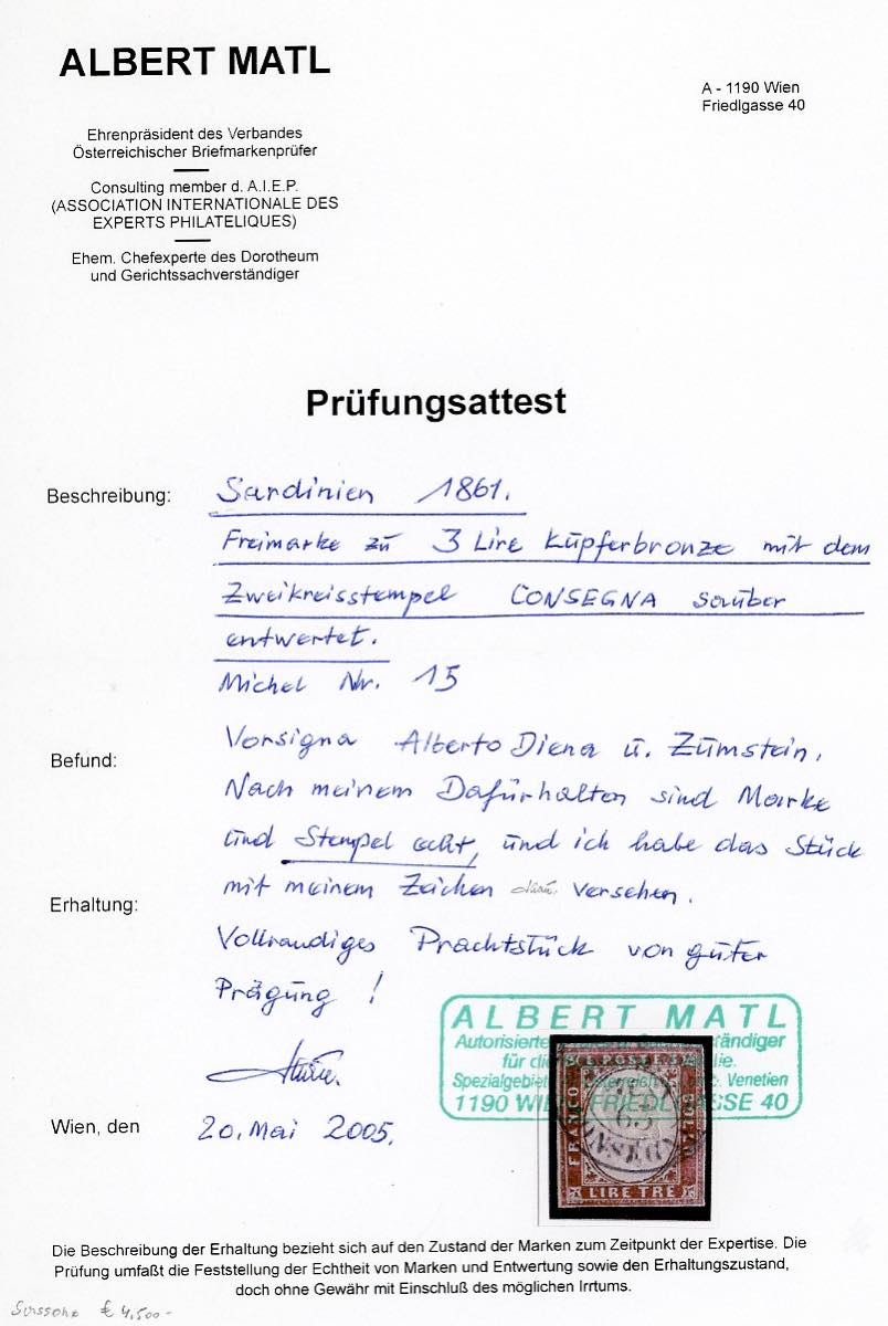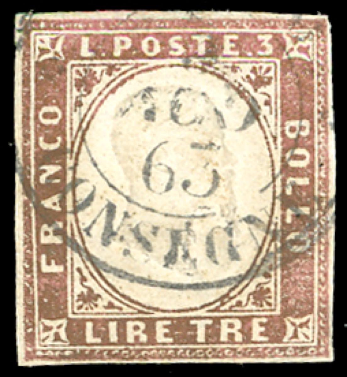 1861 - 3 lire rame vivo (18A), usato, perfetto e con margini bianchi su tutti i lati. Em.Diena, cert. Matl.