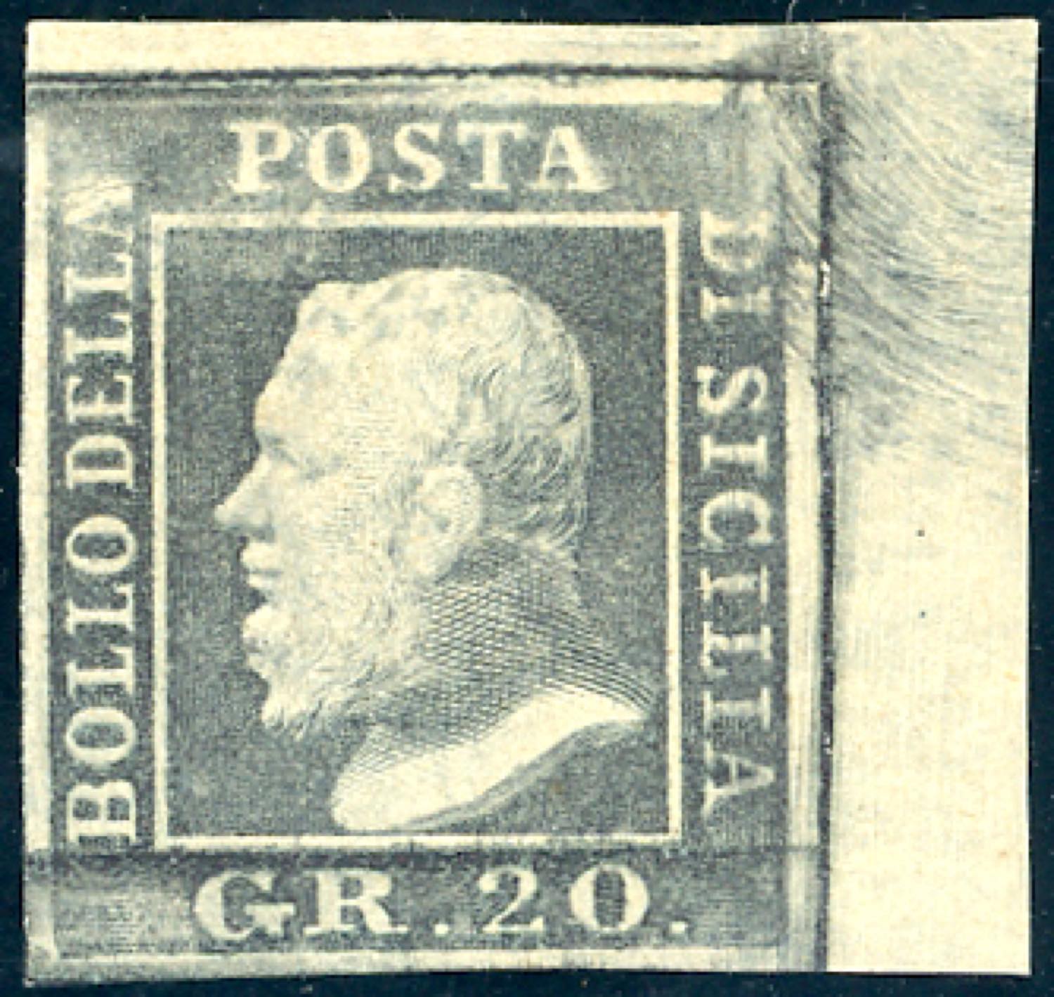 1859 - 20 grana grigio ardesia, pos. 10 (13) , angolo di foglio, gomma originale, perfetto. Qualità lusso. A.Diena.