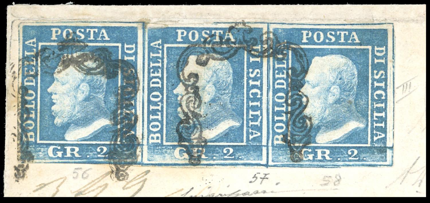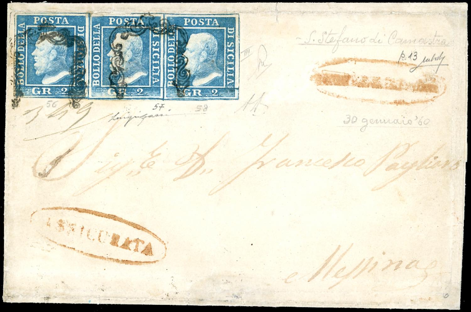 SANTO STEFANO DI CAMASTRA, ovale + assicurata in rosso punti 12 - 2 grana azzurro, III tavola (8), striscia orizzontale di tre, pos. 56-58, perfetta, su lettera del 30/1/1860 per Messina. Raro insieme. A.Diena, Luigi Gazzi.