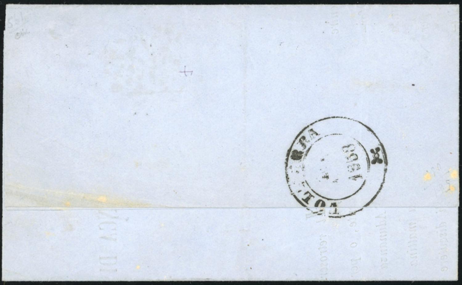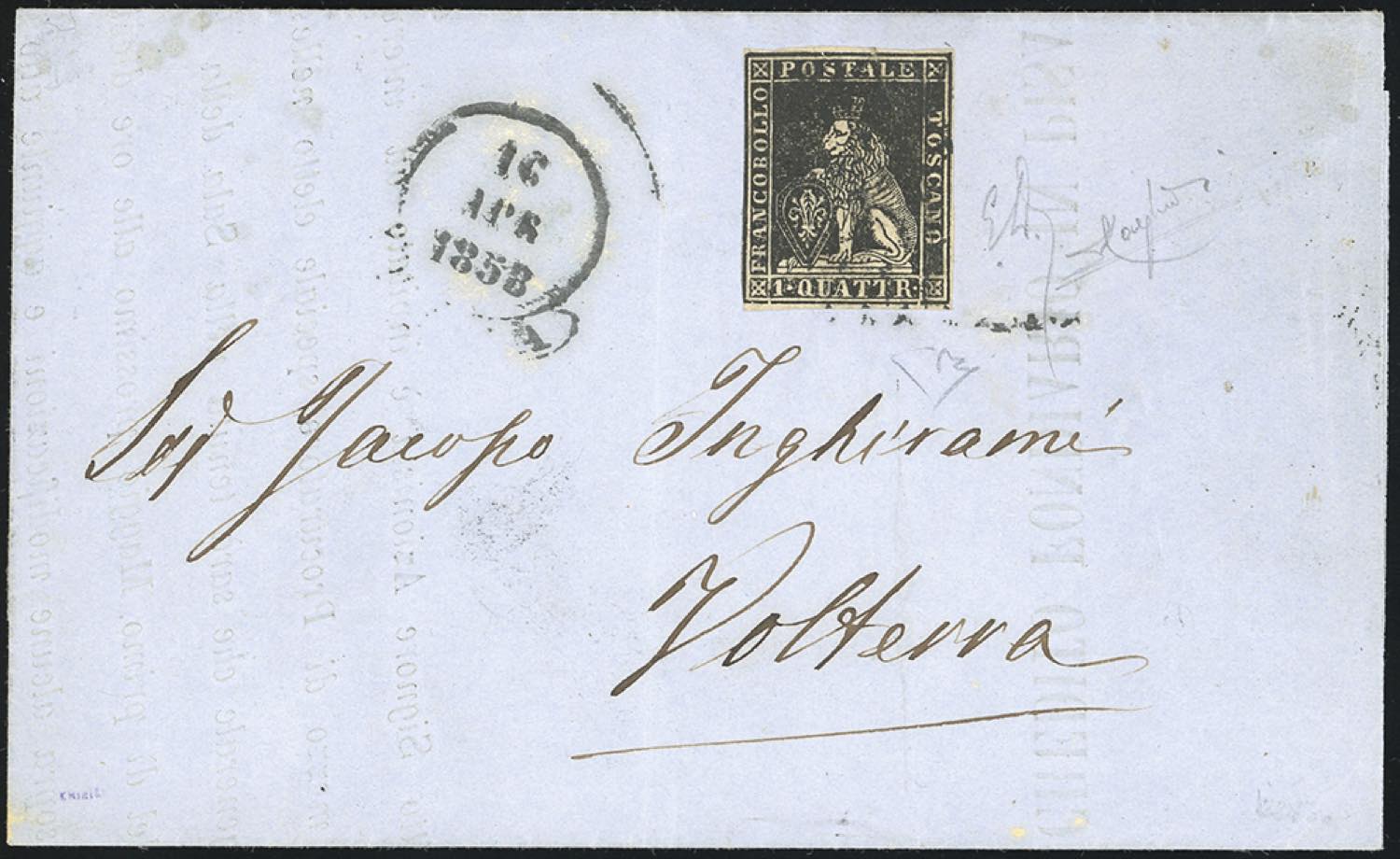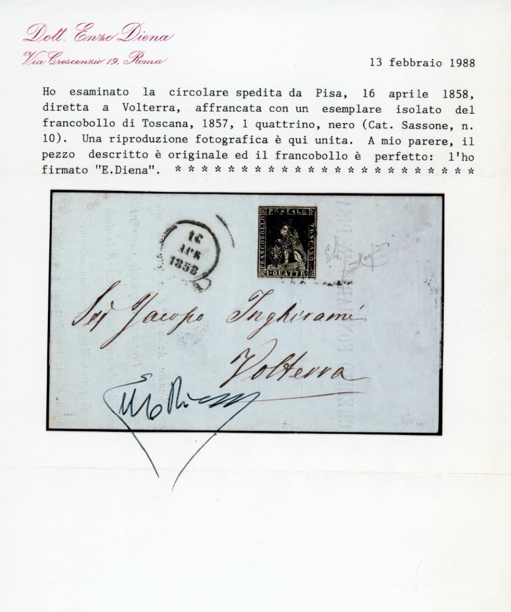 1858 - 1 quattrino nero, II emissione (10), perfetto, isolato su fresca circolare da Pisa 16/4/1858 a Volterra, bollo d'arrivo. Bella e rara! Emilio Diena, L.Raybaudi, cert. E.Diena 1988.