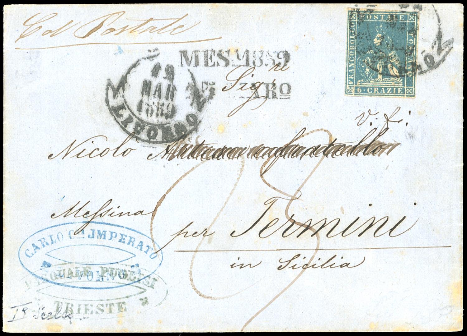 1859 - 6 crazie azzurro chiaro (15), perfetto, su lettera scritta a Trieste ma impostata a Livorno 12/3/1859 tramite il forwarder Jmperato a Termini, manoscritto "Col Postale" e tassa in arrivo 23 grana. Interessante.