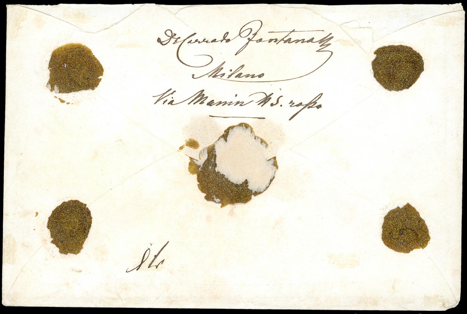 1863 - 15 cent. Litografico, II tipo, due esemplari (13), in affrancatura mista con 5 cent. verde cupo, 40 cent. rosa carminio, due esemplari, IV emissione di Sardegna (13E,16), tutti gli esemplari perfetti e ben marginati, ad eccezione del 5 cent. che ha il margine sinistro appena sfiorato, su busta raccomandata da Desenzano 16/8/1863 a Recoaro. Bella affrancatura tricolore "patriottica", di grande impatto visivo. A.Diena.