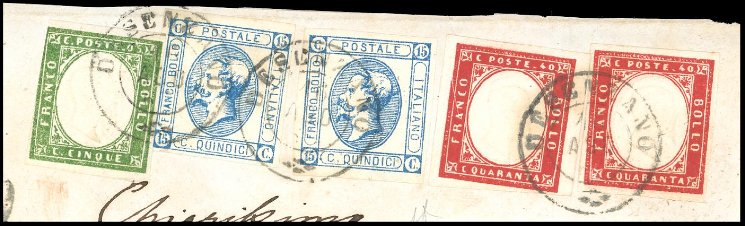 1863 - 15 cent. Litografico, II tipo, due esemplari (13), in affrancatura mista con 5 cent. verde cupo, 40 cent. rosa carminio, due ... Read more