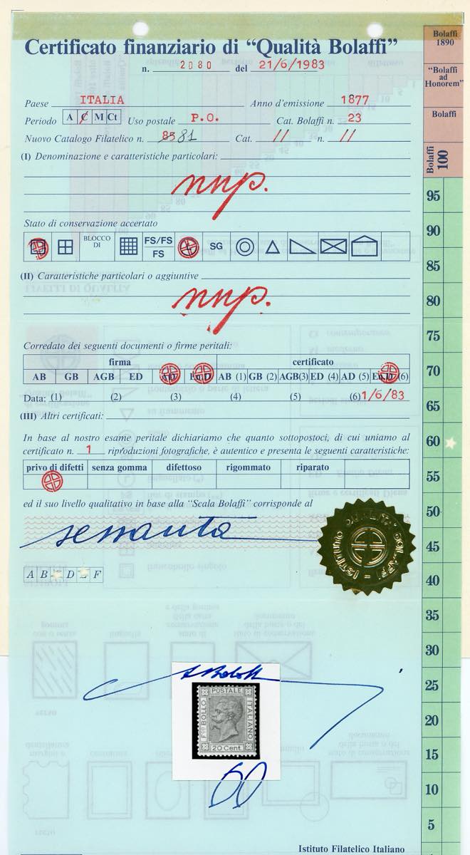 1877 - 20 cent. ocra arancio (28), discreta centratura, gomma originale, perfetto. Molto fresco. A.Diena, cert. E.Diena e Finanziario ... Read more