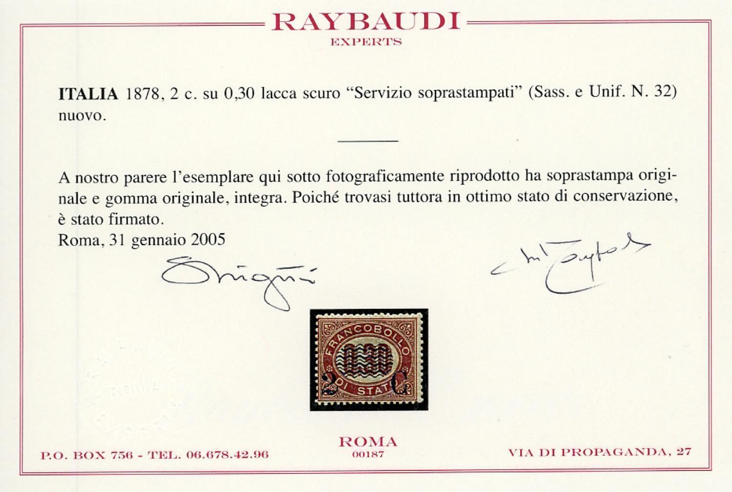 1878 - 2 cent. su 0,30 lire Servizio soprastampati (32), nuovo, gomma originale integra, perfetto, molto fresco. Cert. Raybaudi.