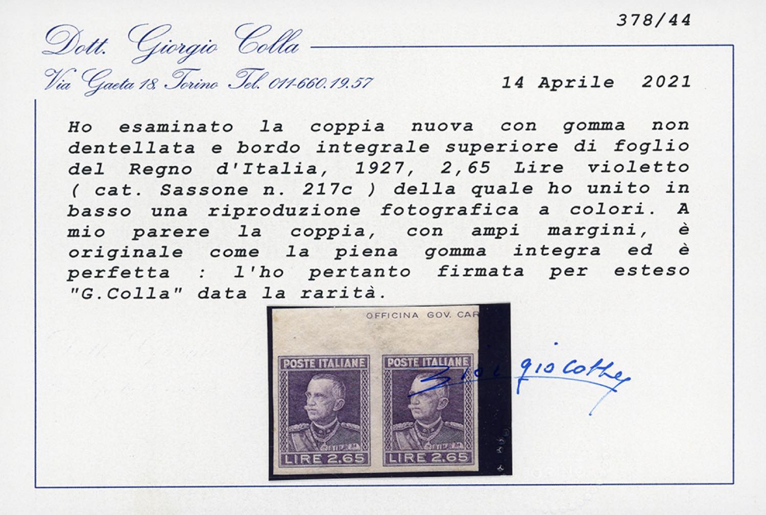 1927 - 2,65 lire Parmeggiani, non dentellato (217c), coppia orizzontale, bordo di foglio, gomma originale integra, perfetta. Rara e di ... Read more