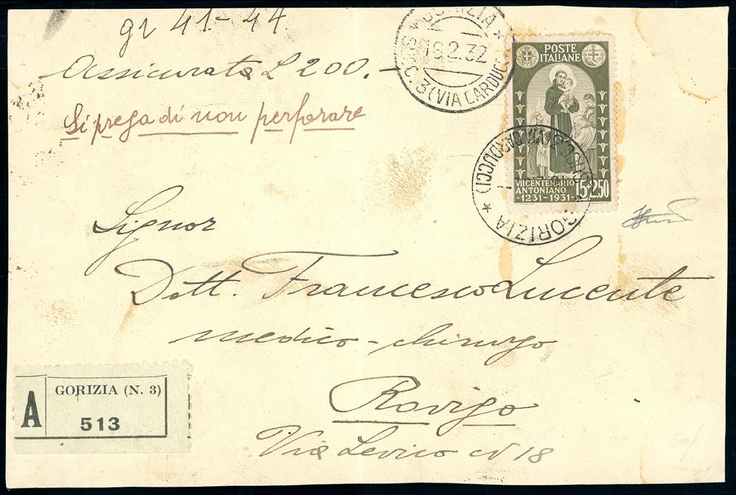 1932 - 5 + 2,50 lire Sant'Antonio (298), perfetto, su frontespizio di assicurata per £ 200 da Gorizia 18/2/1932 a Rovigo. Raro uso isolato. Ferrario.