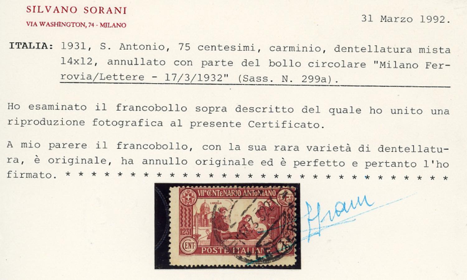 1931 - 75 cent. Sant'Antonio, dent. 14 x 12 (299a), perfetto, usato a Milano 17/3/1932. OLTRE A QUESTO ESEMPLARE SE NE CONOSCE SOLO UNO NUOVO. Grande rarità del Regno d'Italia. Cert. Sorani.