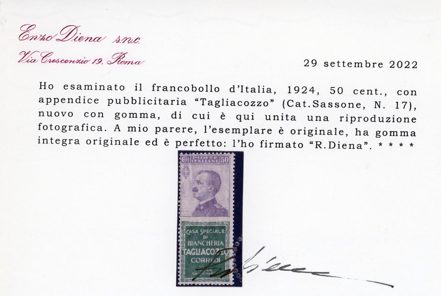 Lot 1599 - 1924 - 50 cent. Tagliacozzo (17), gomma originale integra, ...