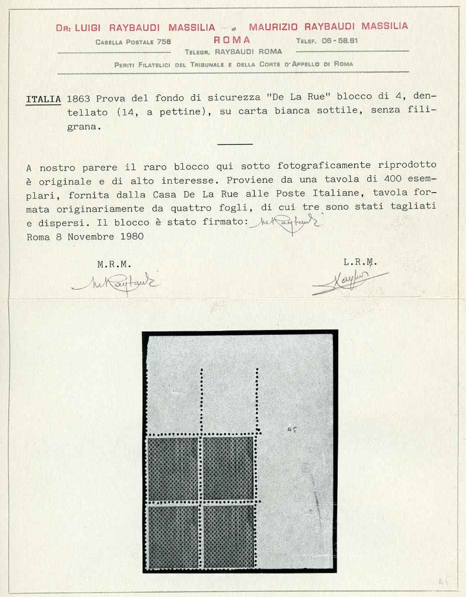 1863 - De La Rue, prova del fondo di sicurezza di piccoli rombi stampato in nero su carta bianca sottile e senza filigrana, dentellata, blocco di quattro, angolo di foglio, senza gomma come sempre, perfetto. Interessante e raro. Cert. Raybaudi.