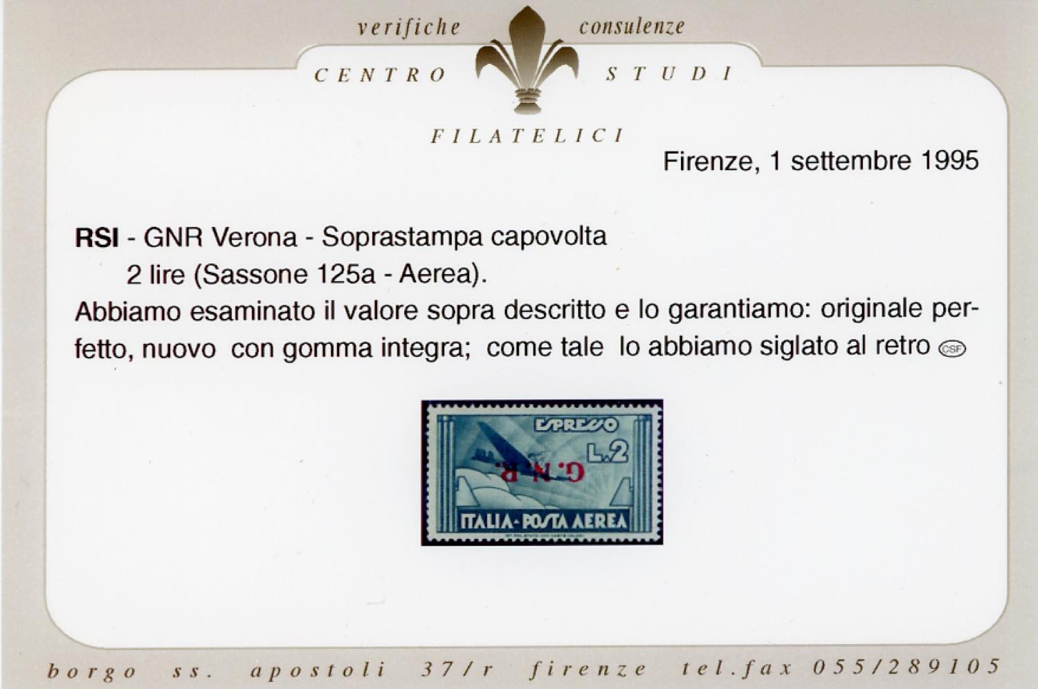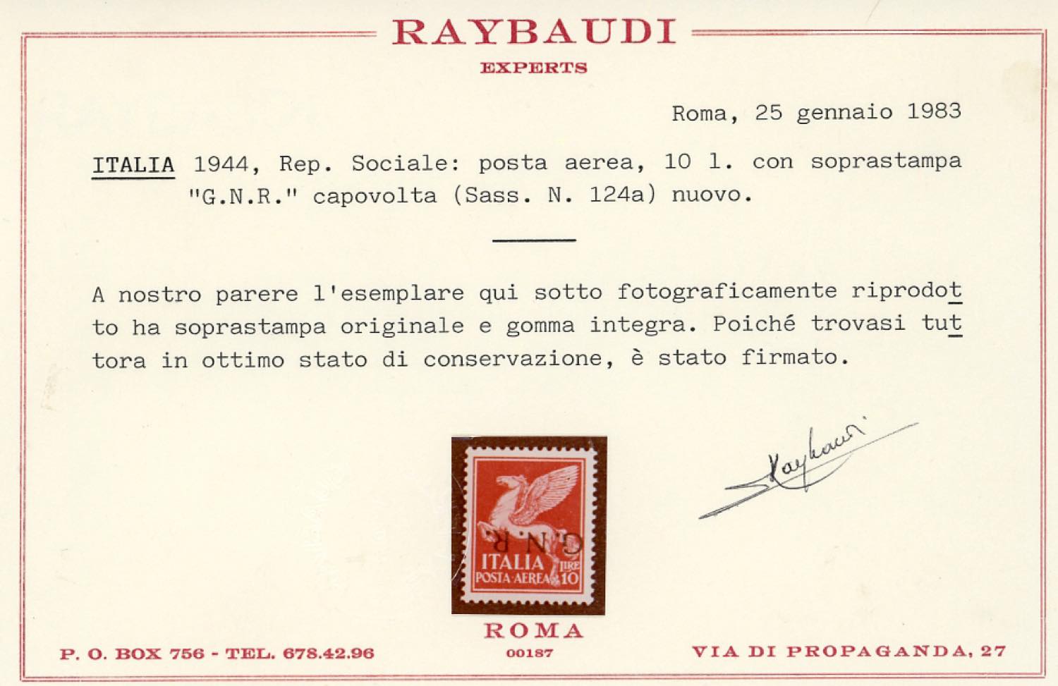 1944 - Soprastampa G.N.R. di Verona, serie completa con la soprastampa capovolta (117a/125a), gomma originale integra, perfetti. Tutti firmati da noti periti, cert. Raybaudi per il 10 lire e Sorani per il 2 lire ardesia.