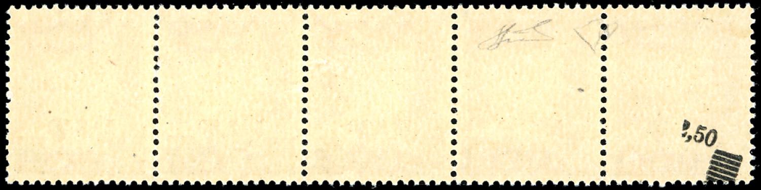 1945 - 2,50 lire su 1,75 lire Imperiale, striscia orizzontale di cinque, il primo esemplare senza soprastampa al recto e solo parziale al ... Read more