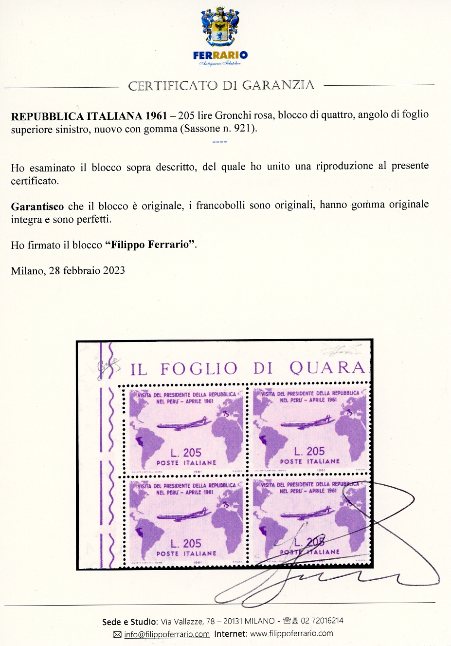 1961 - 205 lire Gronchi rosa (921), blocco di quattro, angolo di foglio, gomma originale integra, perfetto. Bello. Cert. Ferrario.