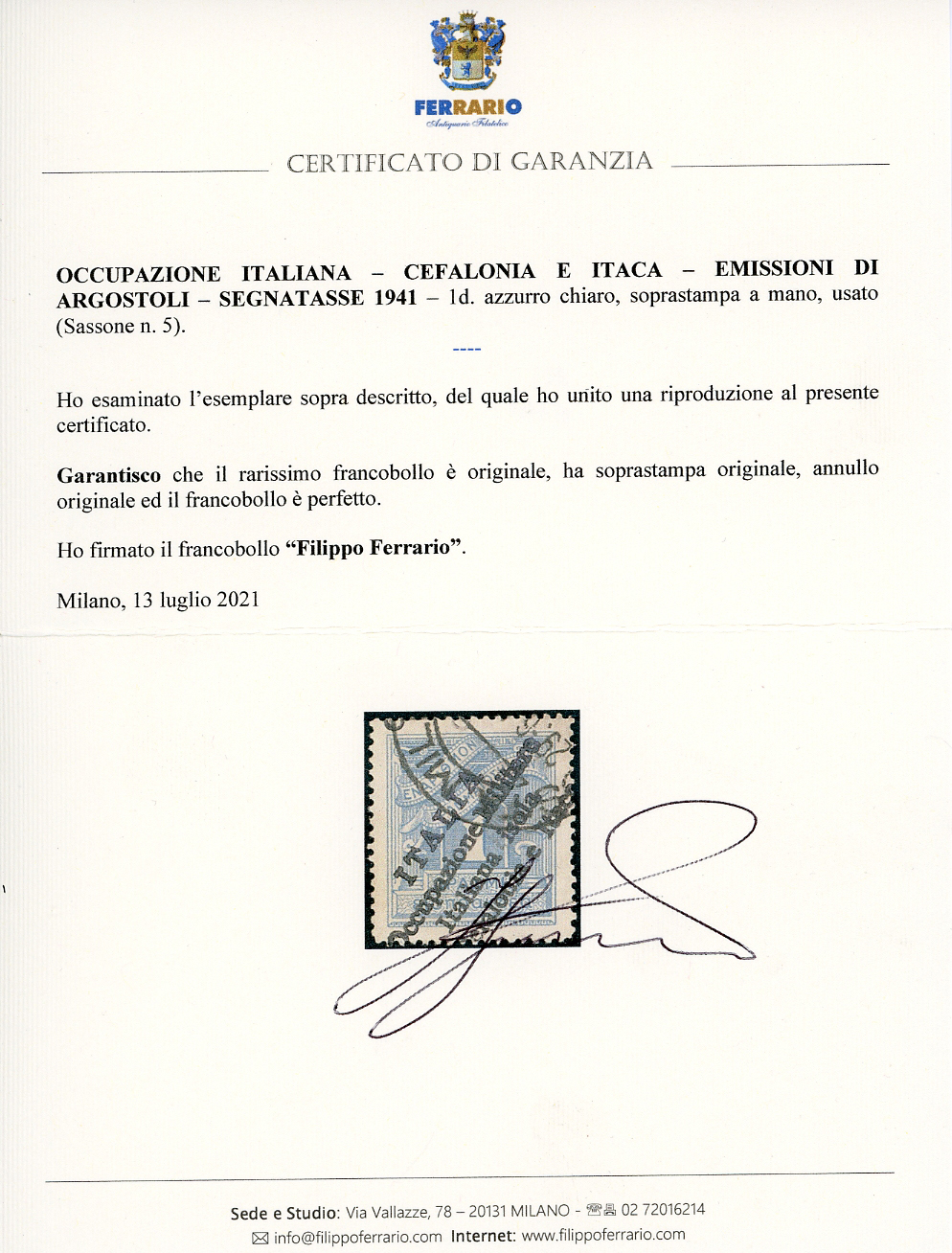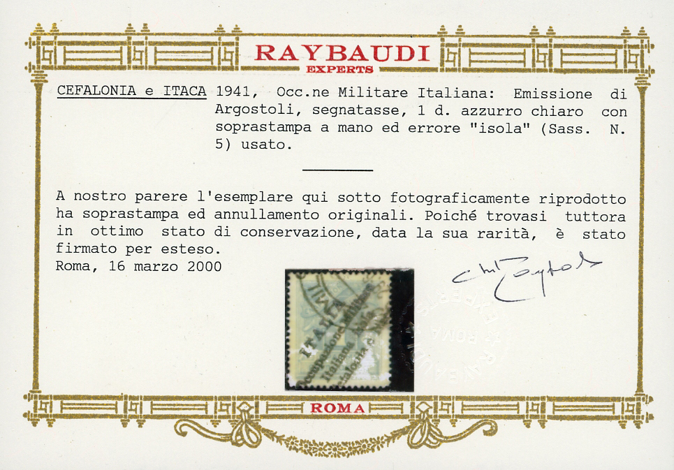 EMISSIONI DI ARGOSTOLI SEGNATASSE 1941 - 1 d., soprastampa a mano (5), usato, perfetto. Rarissimo. Cert. Oro Raybaudi, E.Diena e Ferrario. Read more