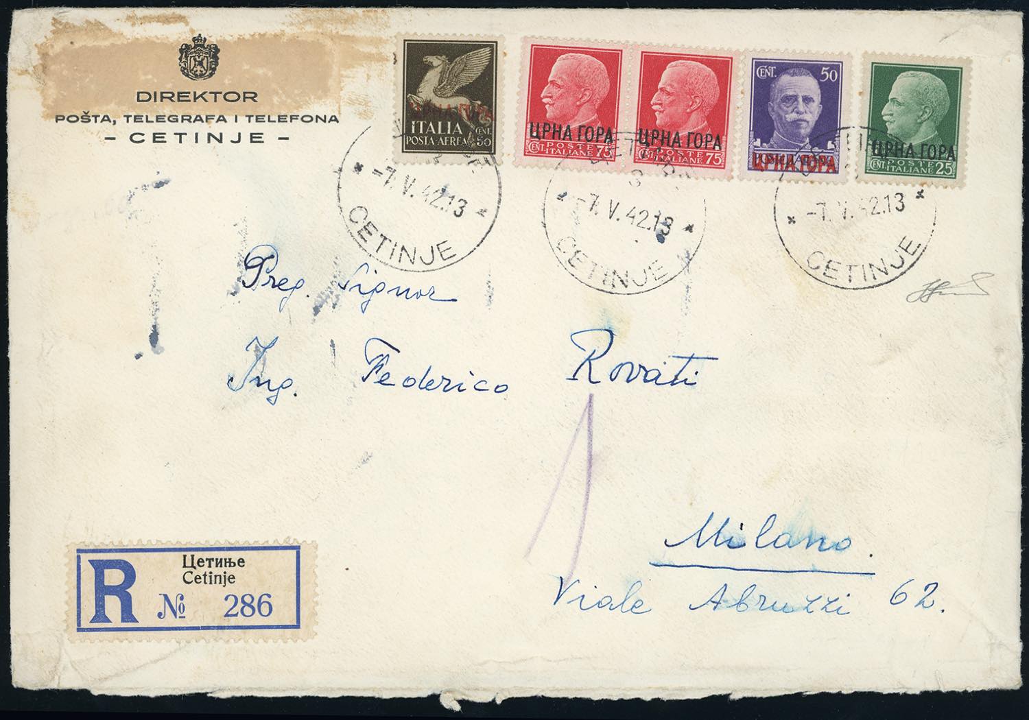 MONTENEGRO 1942 - 25 cent., 50 cent., 75 cent., coppia, Imperiale, 50 cent. posta aerea (19,21,22,A9), perfetti, su busta raccomandata da Cettigne 7/5/1942 a Milano. Rara. Ferrario.