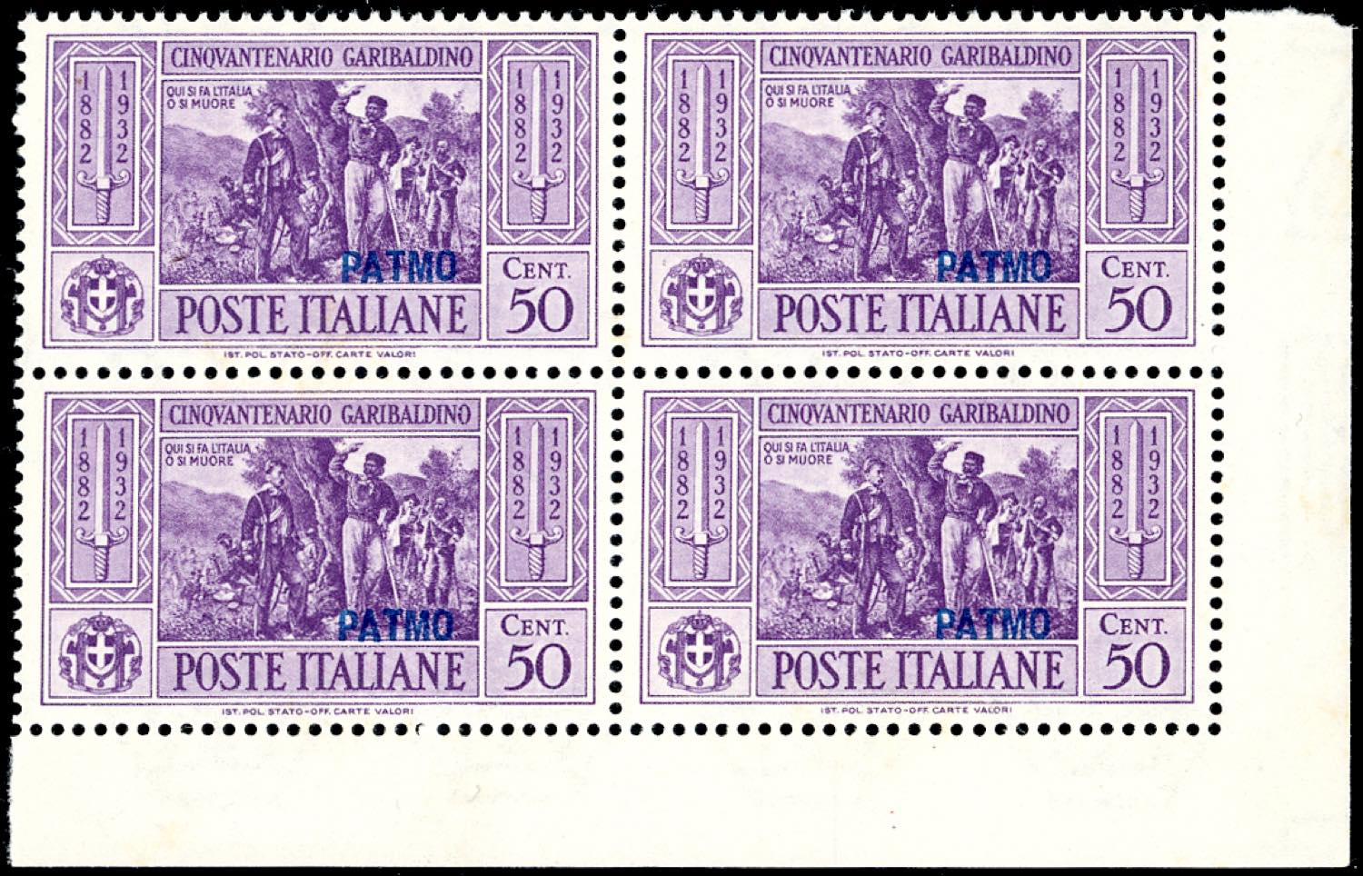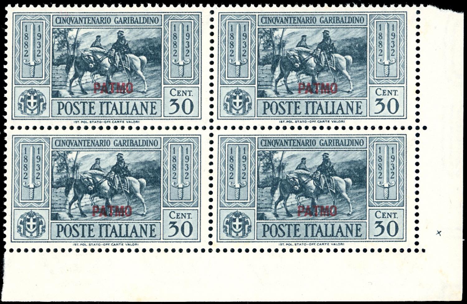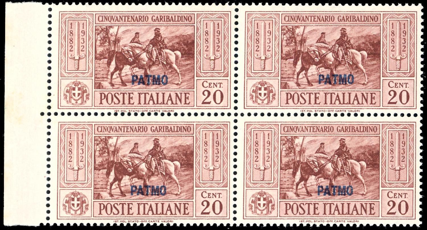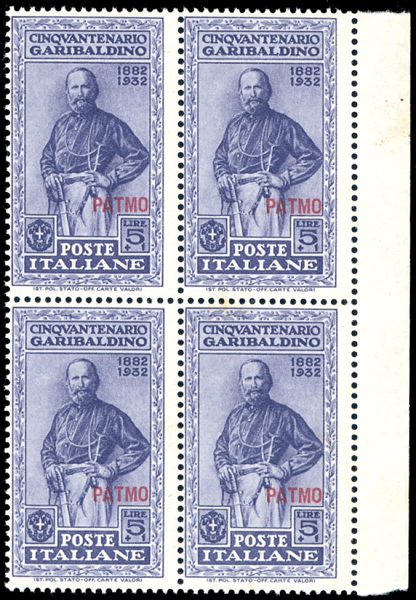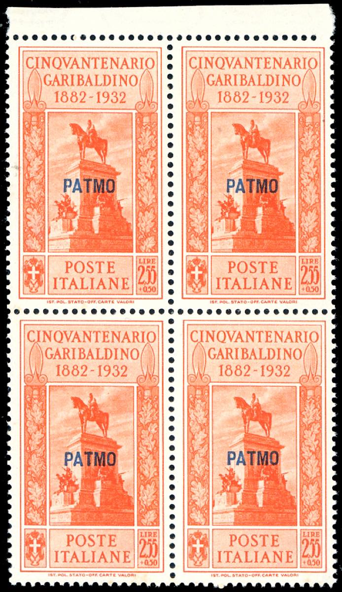 PATMO 1932 - Garibaldi, serie completa (17/26), blocchi di quattro, angolo/bordo di foglio, gomma originale integra, perfetti, ottima qualità. Cert. Ferrario.