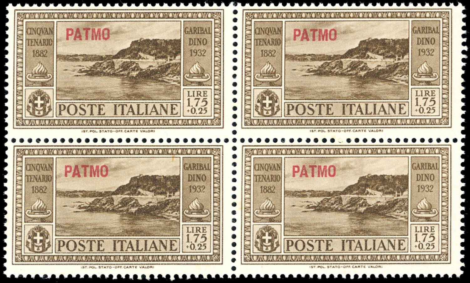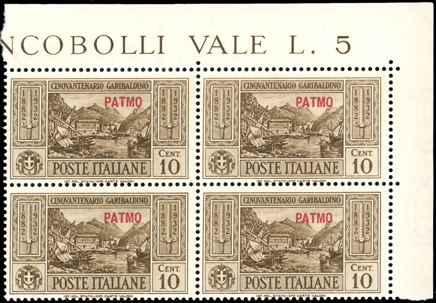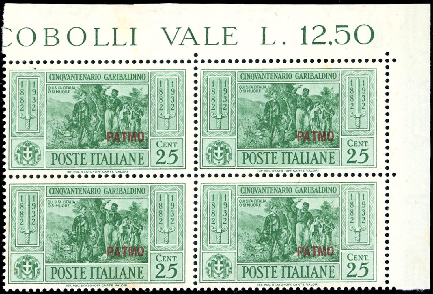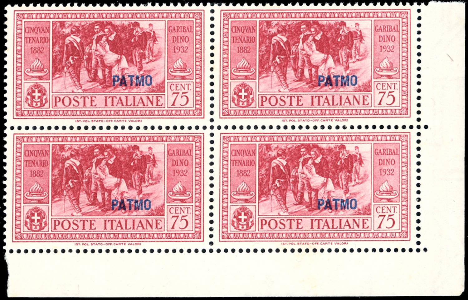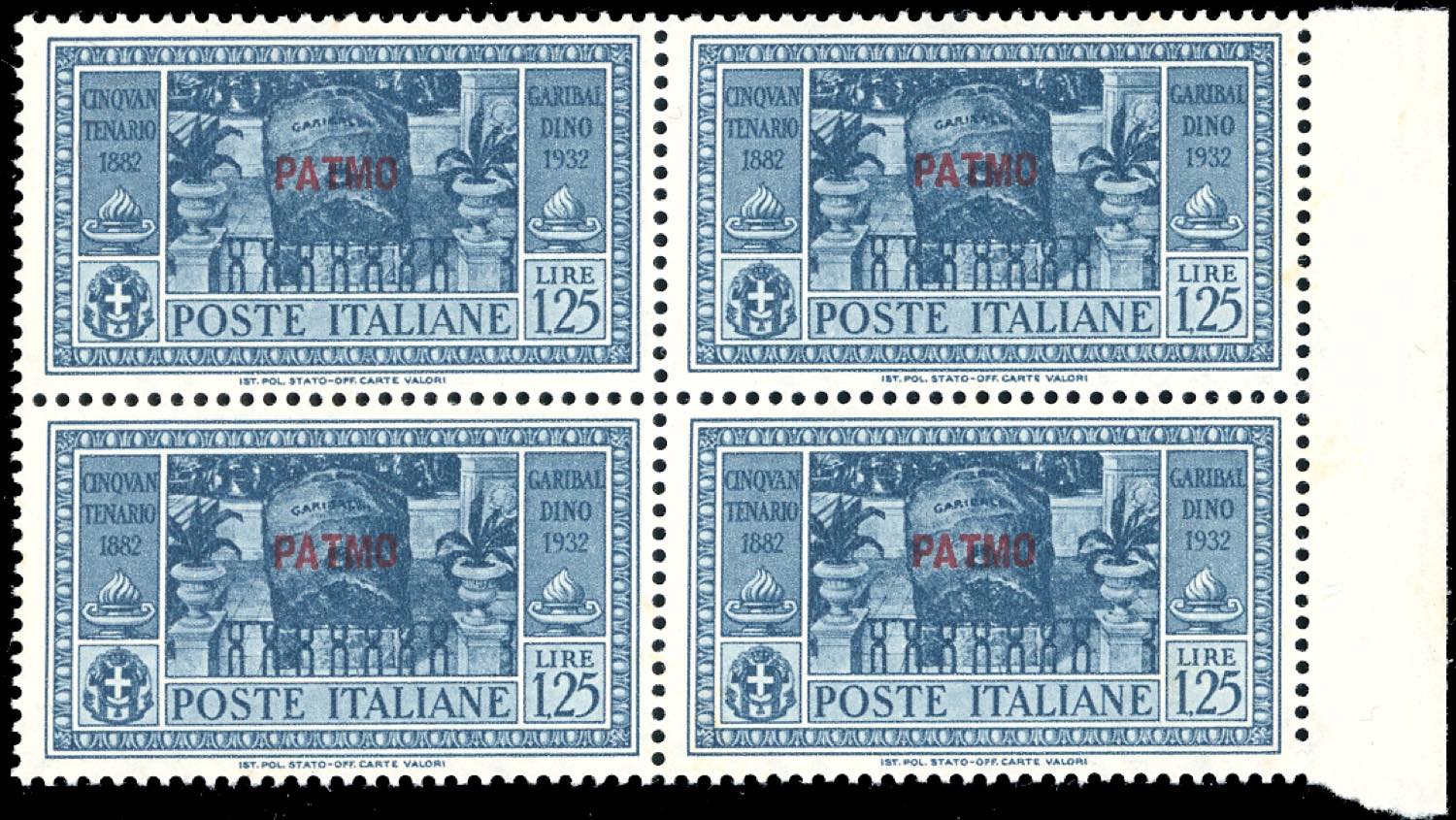 PATMO 1932 - Garibaldi, serie completa (17/26), blocchi di quattro, angolo/bordo di foglio, gomma originale integra, perfetti, ottima qualità. Cert. Ferrario.