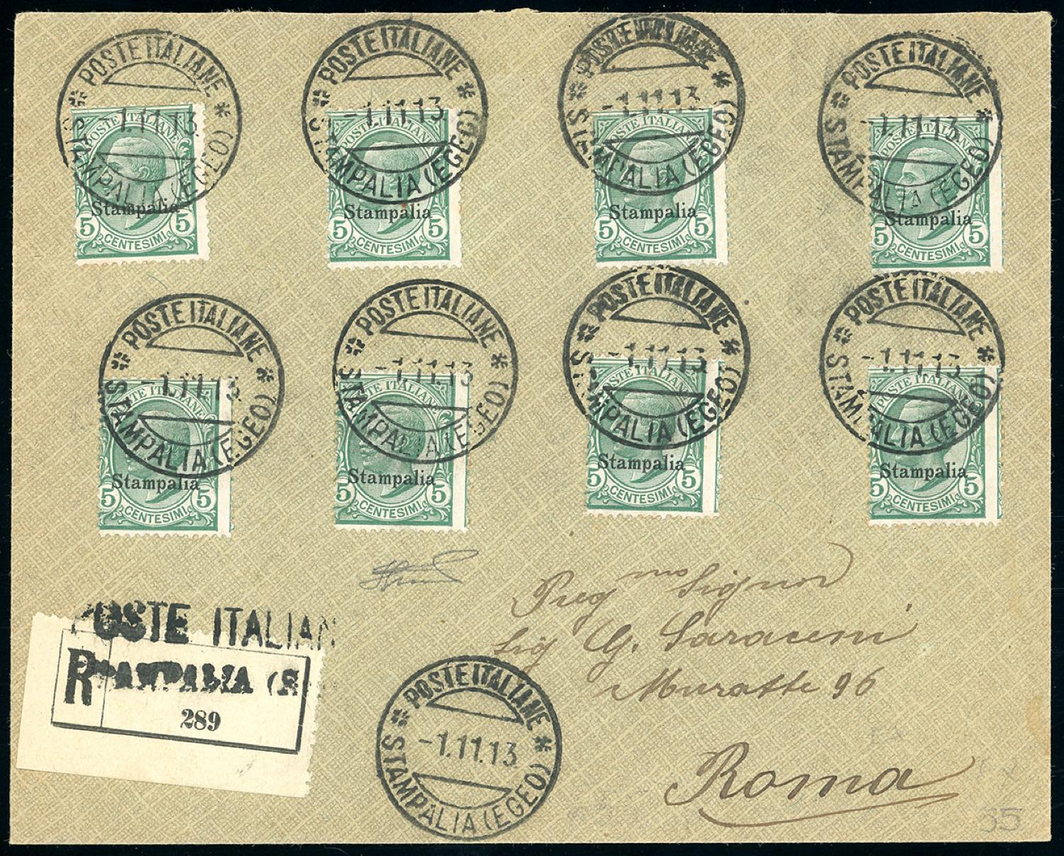 STAMPALIA 1913 - 5 cent. soprastampato (2), otto esemplari, perfetti, su busta raccomandata da Stampalia 1/11/1913 a Roma. Rara! Ferrario.