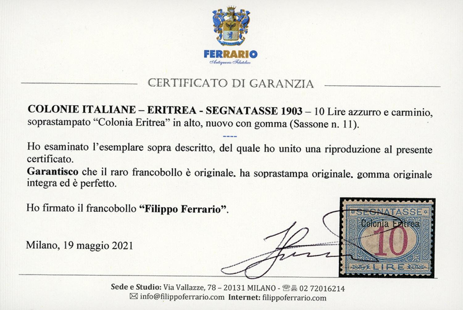 SEGNATASSE 1903 - 10 lire azzurro e carminio, soprastampato (11), nuovo, gomma originale integra, perfetto. Molto fresco a raro. A.Diena, cert. Ferrario.