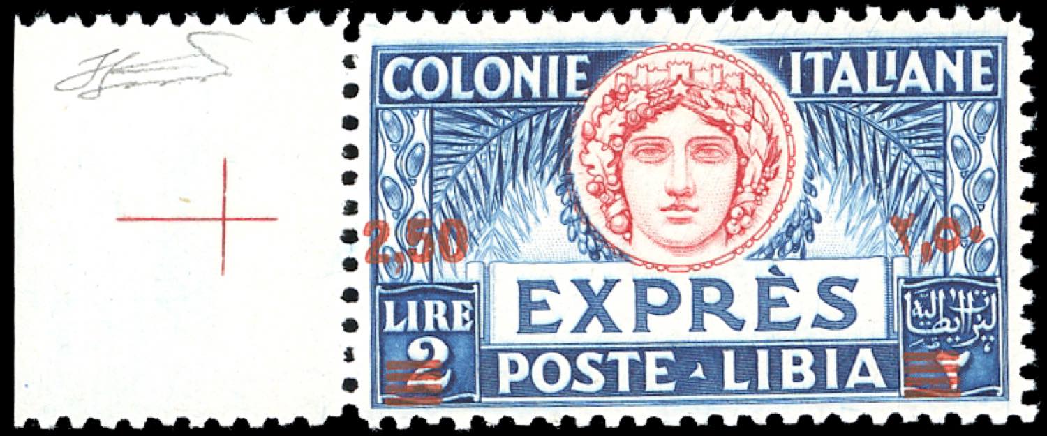ESPRESSI 1933 - 2,50 su 2 lire, dent. 11, soprastampato (13), nuovo, gomma originale integra, perfetto, bordo di foglio. Splendido e ottimamente centrato. Cert. Ferrario.