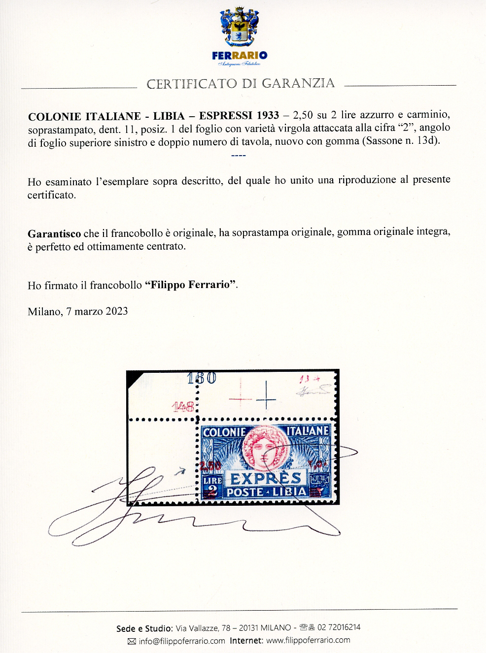 ESPRESSI 1933 - 2,50 su 2 lire, dent. 11, soprastampato, posiz. 1 del foglio con varietà virgola attaccata alla cifra 2 (13d), angolo di foglio superiore sinistro con doppio numero di tavola, nuovo, gomma originale integra, perfetto. Splendido per freschezza e centratura, molto raro. Cert. Ferrario.