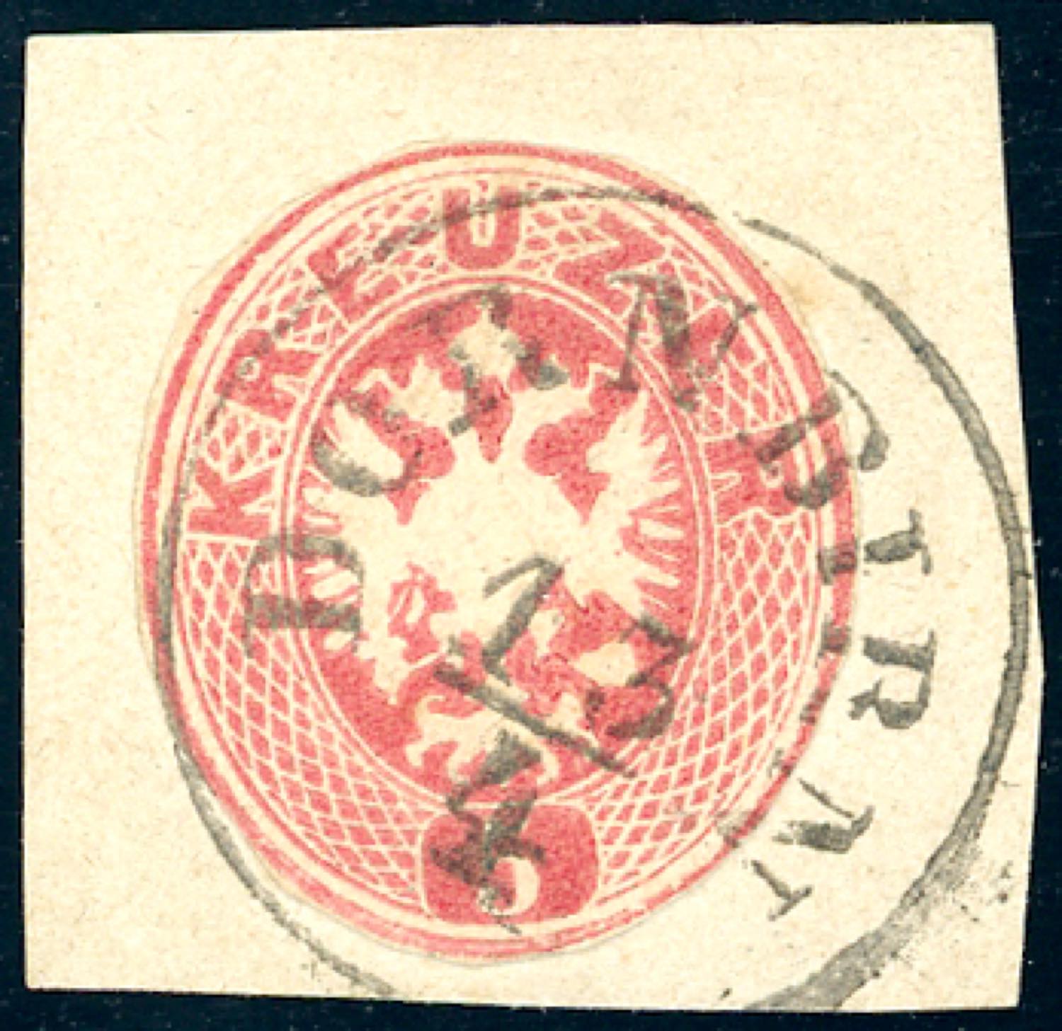 AUSTRIA INTERI POSTALI 1863 - 5 kr. rosso, ritaglio lungo l'ovale (lilliput) dell'intero postale, applicato e usato su frammento a Dornbrin 13/4. Non comune.