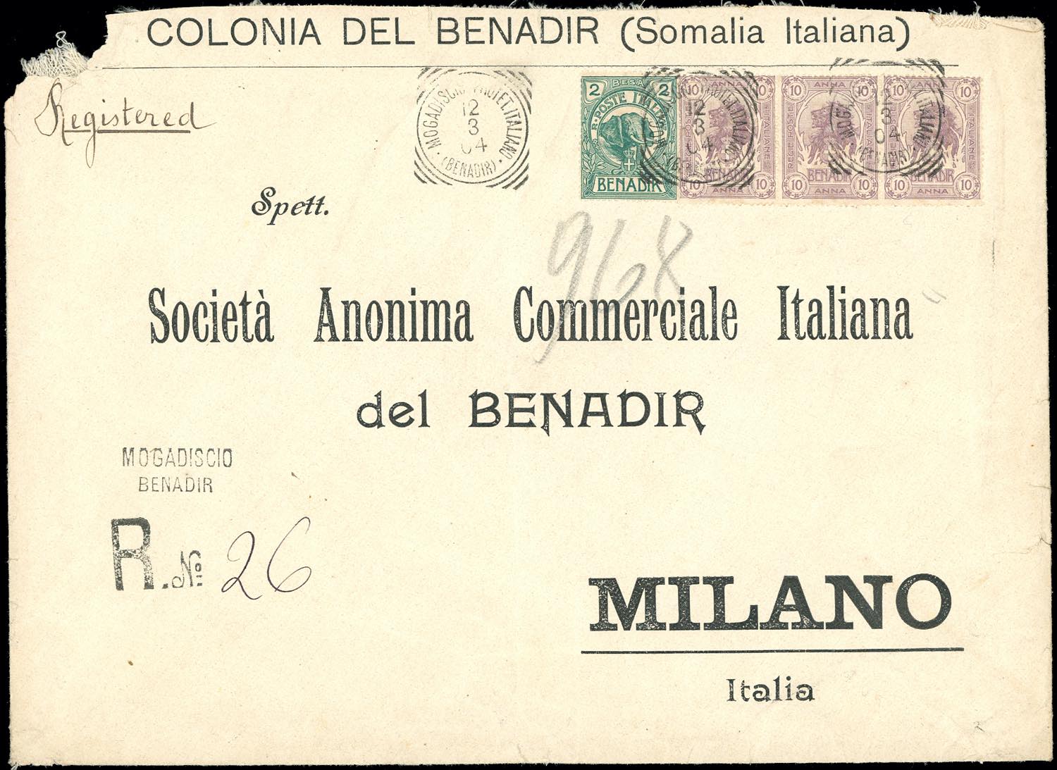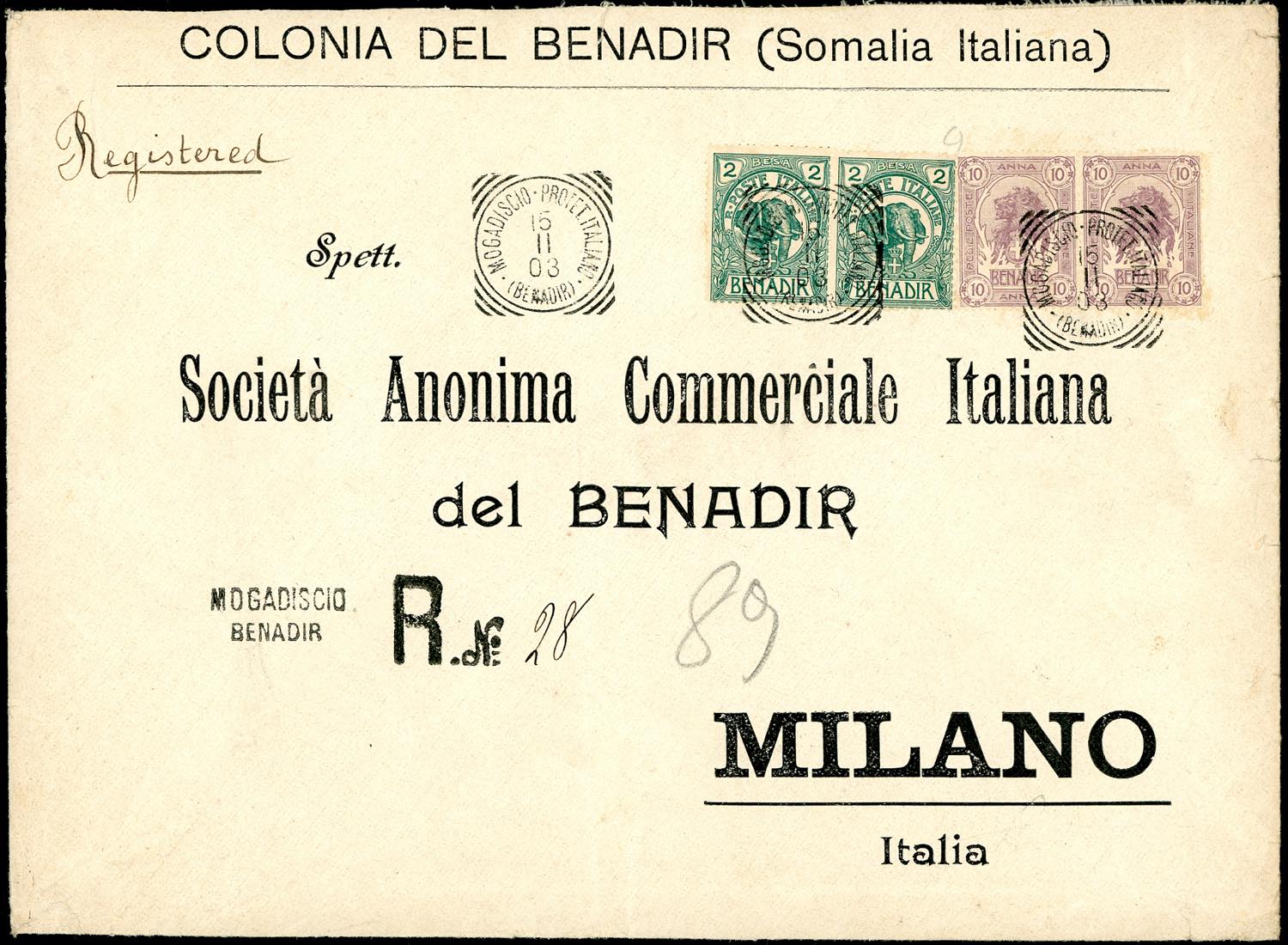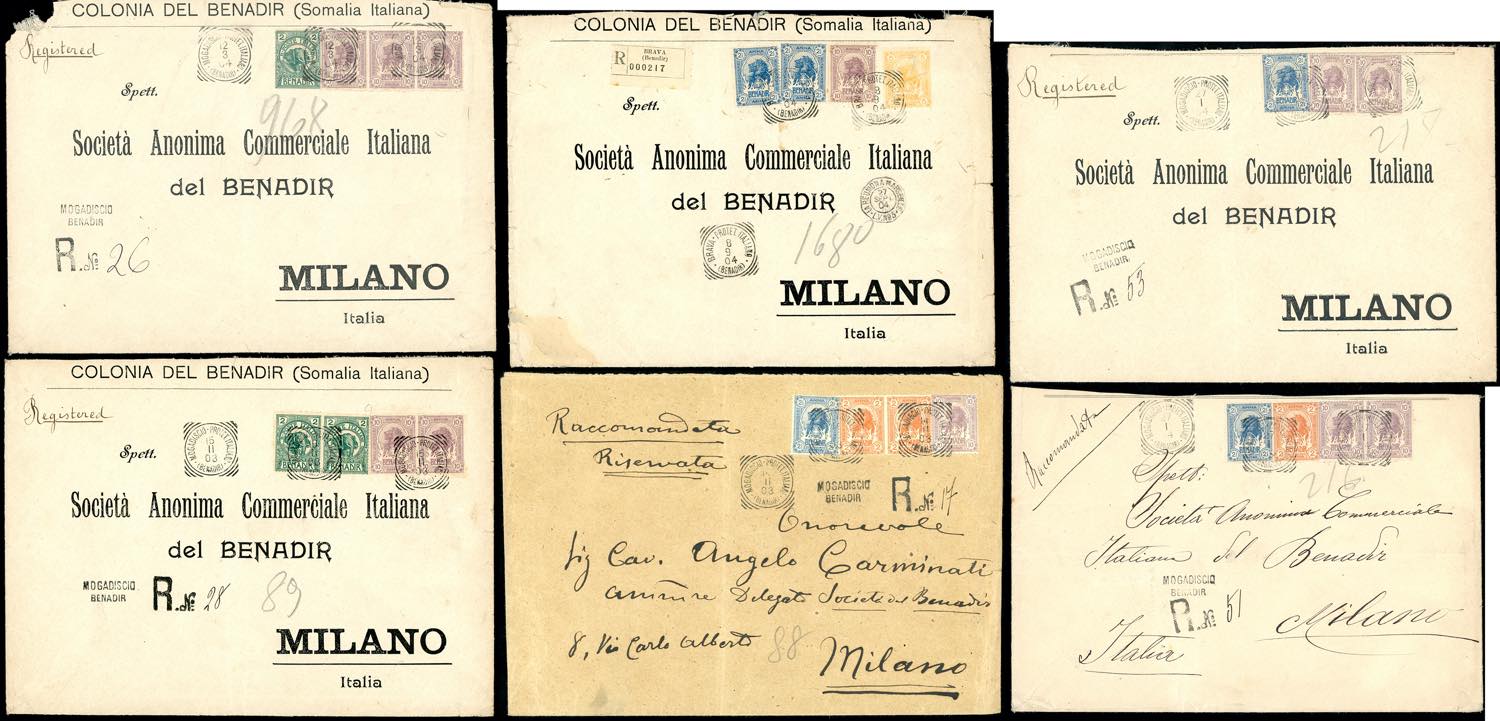 SOMALIA 1903/1904 - Eccezionale insieme di sei buste raccomandate dalla Somalia, tutte con affrancature che comprendendono il 10 anna della I emissione Elefanti e Leoni, anche in coppia o striscia di tre. Insieme unico e irripetibile, ad oggi inedito. Per specialista o professionista.