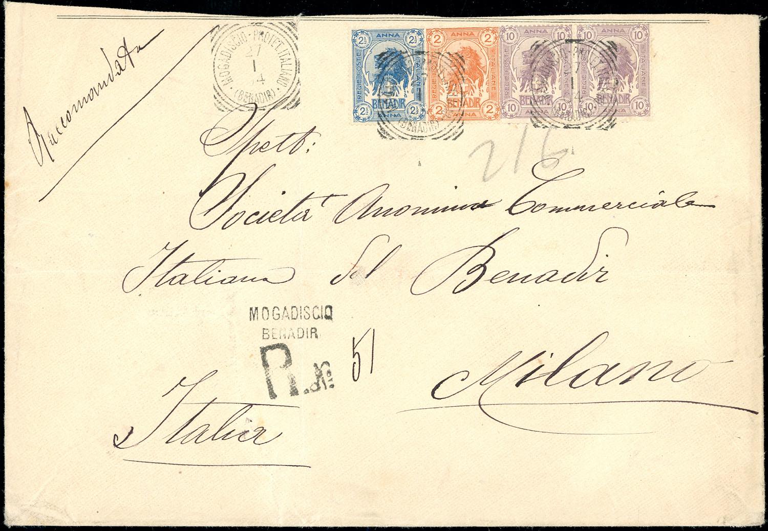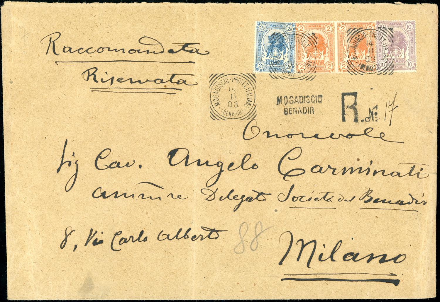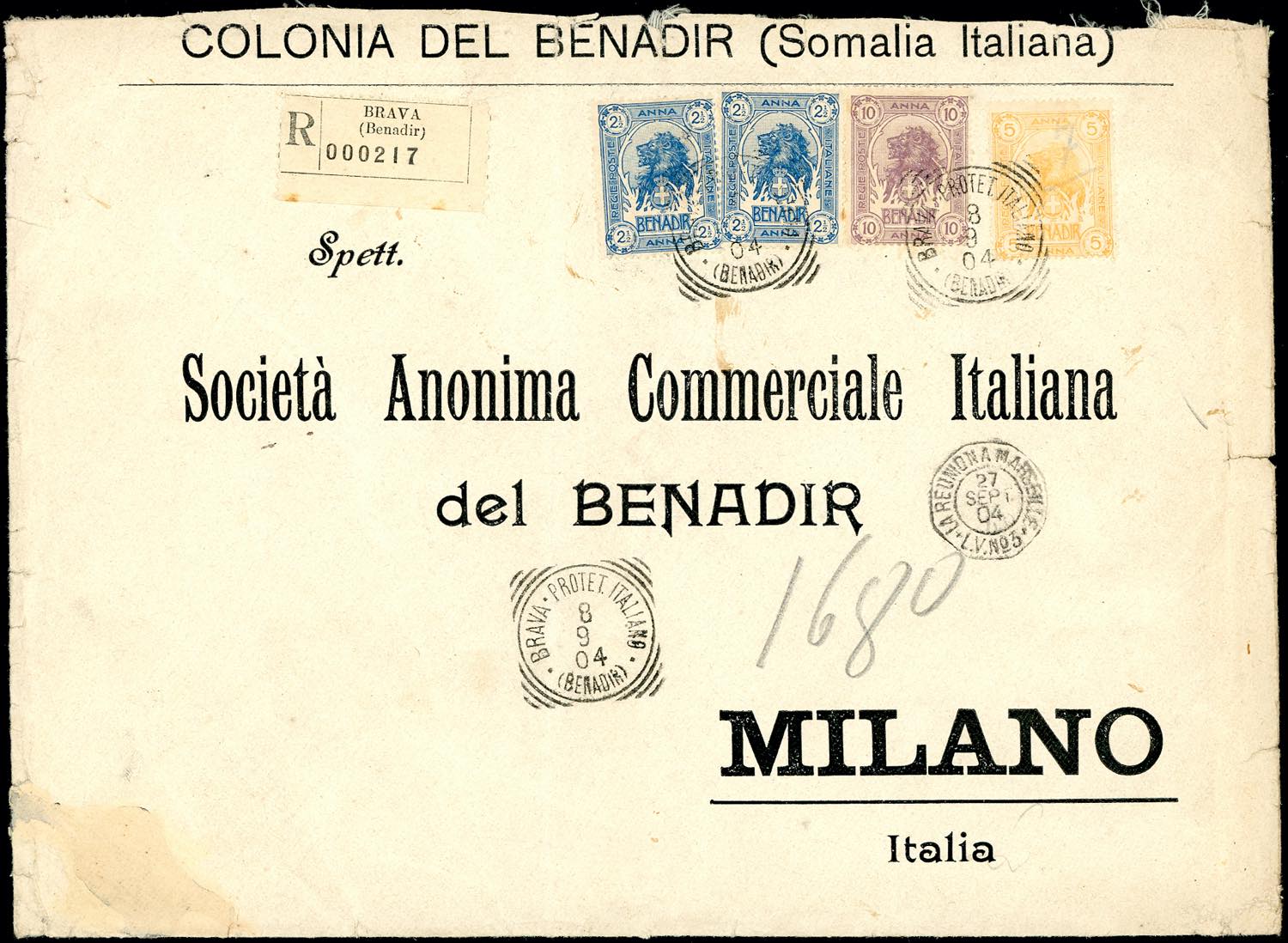 SOMALIA 1903/1904 - Eccezionale insieme di sei buste raccomandate dalla Somalia, tutte con affrancature che comprendendono il 10 anna della I emissione Elefanti e Leoni, anche in coppia o striscia di tre. Insieme unico e irripetibile, ad oggi inedito. Per specialista o professionista.