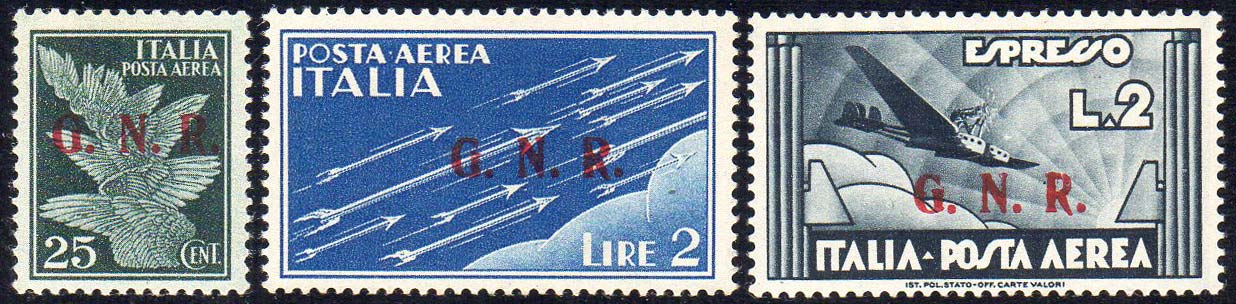 1943 - 25 cent., 2 lire azzurro, 2 lire ardesia, soprastampa G.N.R. di Brescia del III tipo (117/III,122/III,125/III), gomma integra, ... Read more