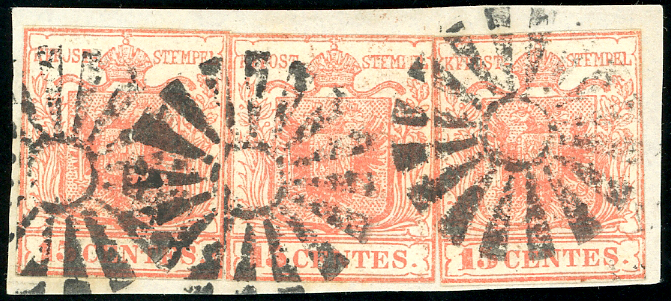 MILANO, muto punti 11 - 15 cent. (3e), tre esemplari ritagliati lilliput lungo i margini, usati su piccolo frammento. Non comune. Cert. E.Diena.