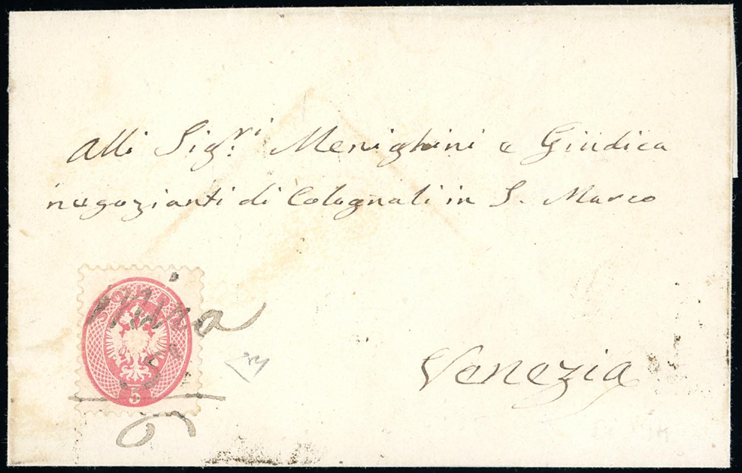 MIRA, a penna punti 13 - 5 soldi (43), perfetto, su lettera del 5/6 per Venezia. Pregevole annullamento, ottima qualità. Cert. E.Diena.