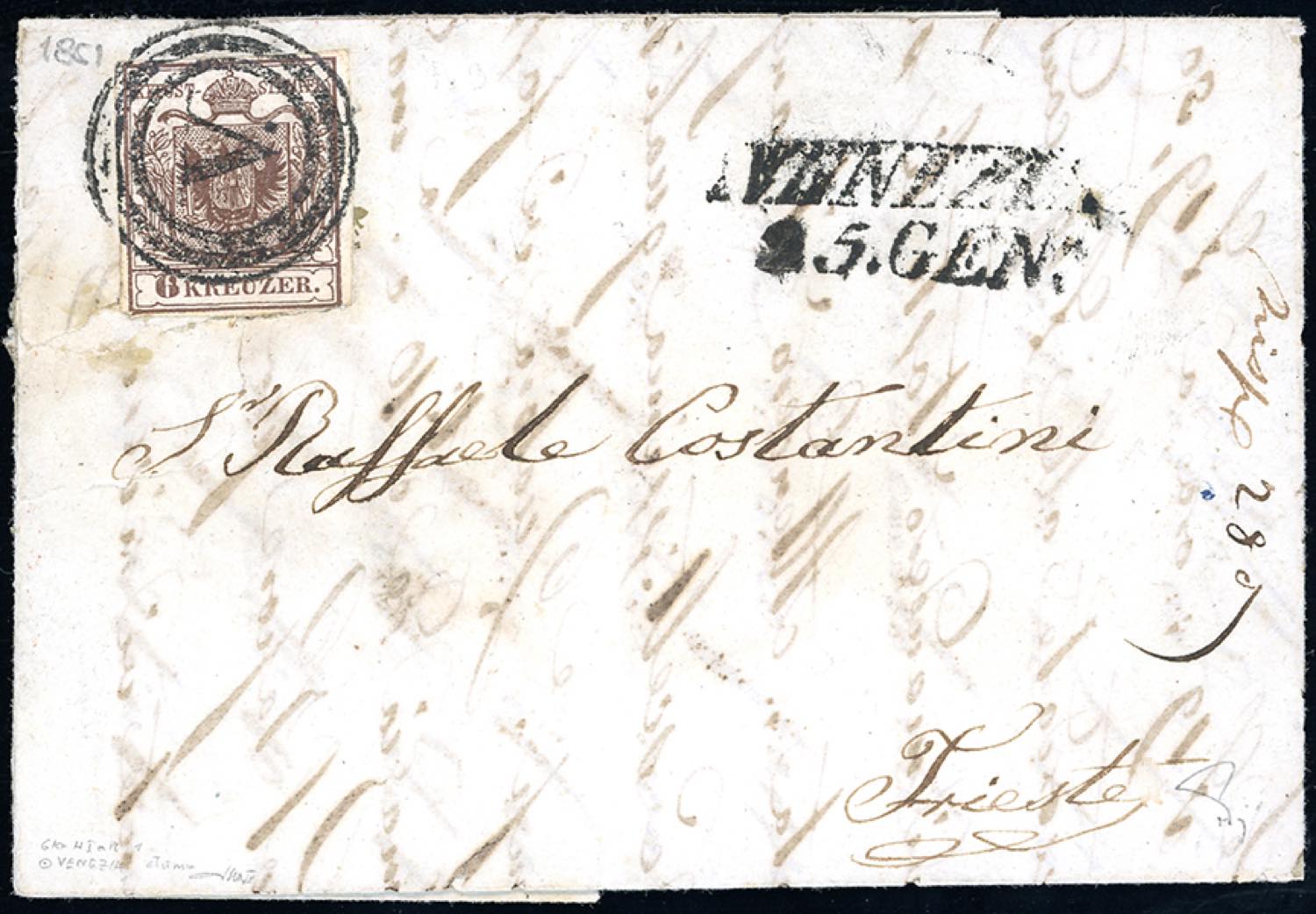 VENEZIA, muto + SI punti 11 - 6 kr. d'Austria (Unificato 4), leggermente sfiorato in basso, su fresca lettera del 25/1/1851 a Trieste. ... Read more