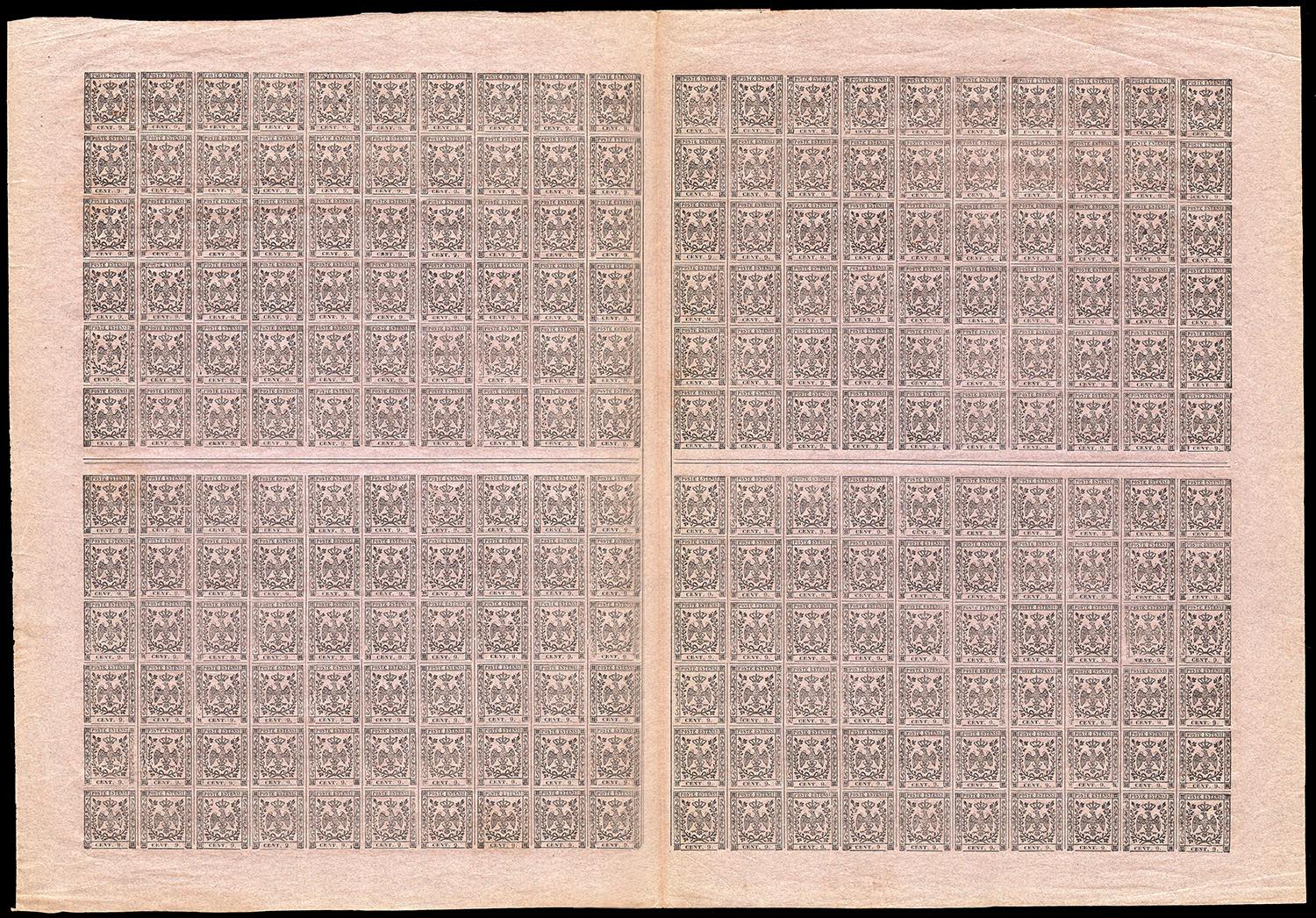 1855 - 9 cent. violetto grigio, non emesso (3), foglio completo di 240 esemplari, suddiviso in quarti da 60 esemplari con interspazi di ... Read more