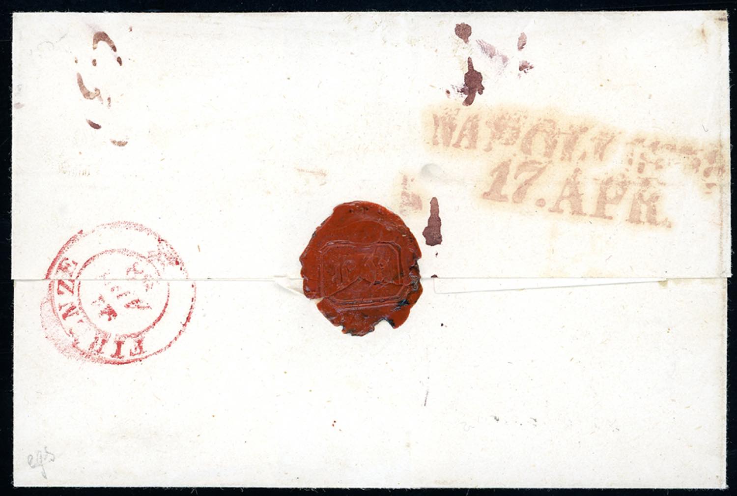1858 - 5 grana rosa lillaceo, I tavola, coppia orizzontale con notevole cattivo allineamento (8a+8h), perfetta, ampi margini, su fresca lettera da Napoli 17/4/1858 a Firenze, tassata 12 crazie. Rara. Emilio Diena, cert. Ferrario,. Ex coll. Imperato.