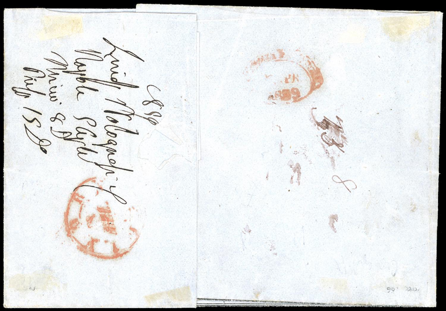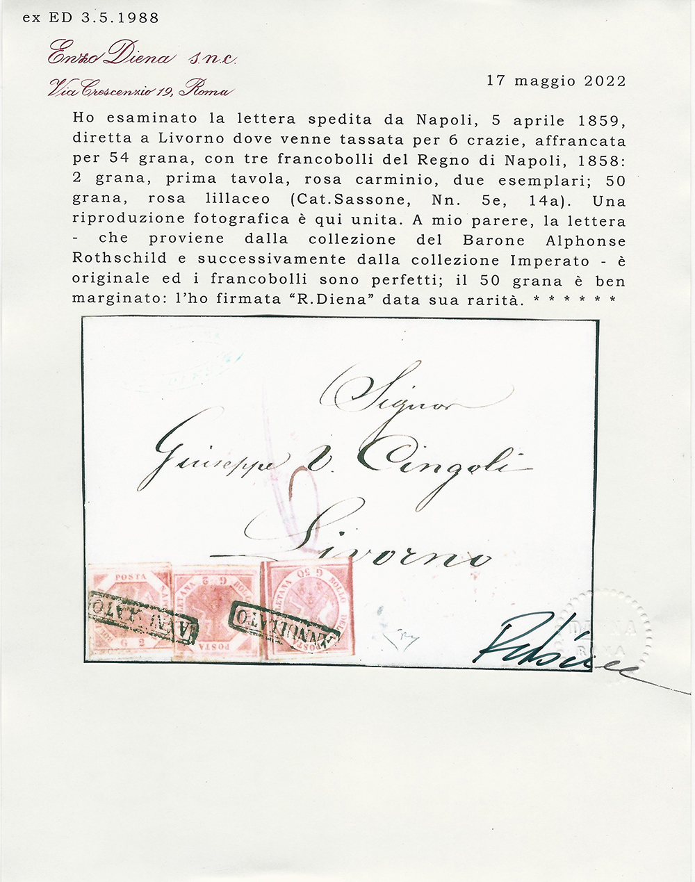 1859 - 50 grana rosa brunastro, fresco e con grandi margini, 2 grana rosa chiaro, I tavola, due esemplari (14,5), tutti perfetti, su fresca lettera da Napoli aprile 1859 a Livorno, tassata 6 crazie.