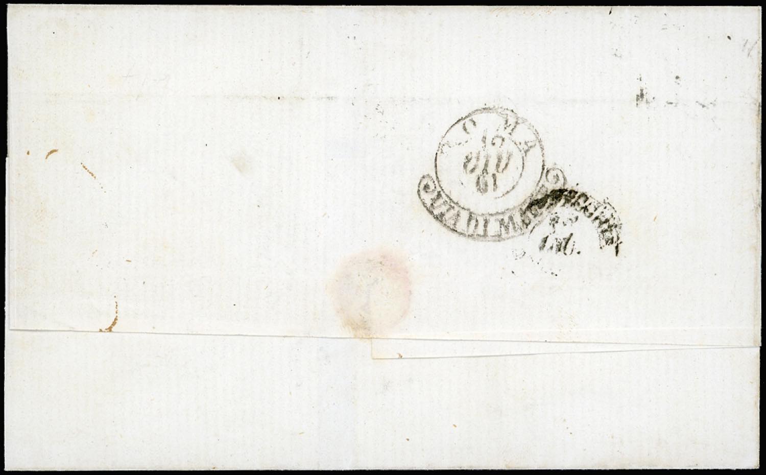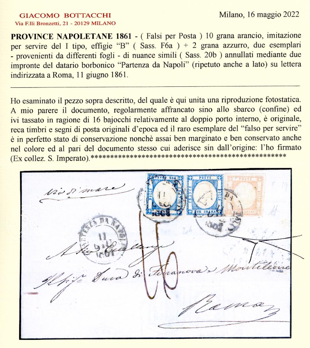 1861 - 10 grana arancio, falso per posta del I tipo, effigie B, perfetto e ben maginato, 2 grana azzurro, due esemplari (F6a,20b), su sovracoperta di lettera da Napoli 11/6/1861 a Roma, bollo della via di mare di Civitavecchia, tassata 16 grana. Rara e molto bella. A.Diena, cert. Bottacchi. Ex coll. Imperato.