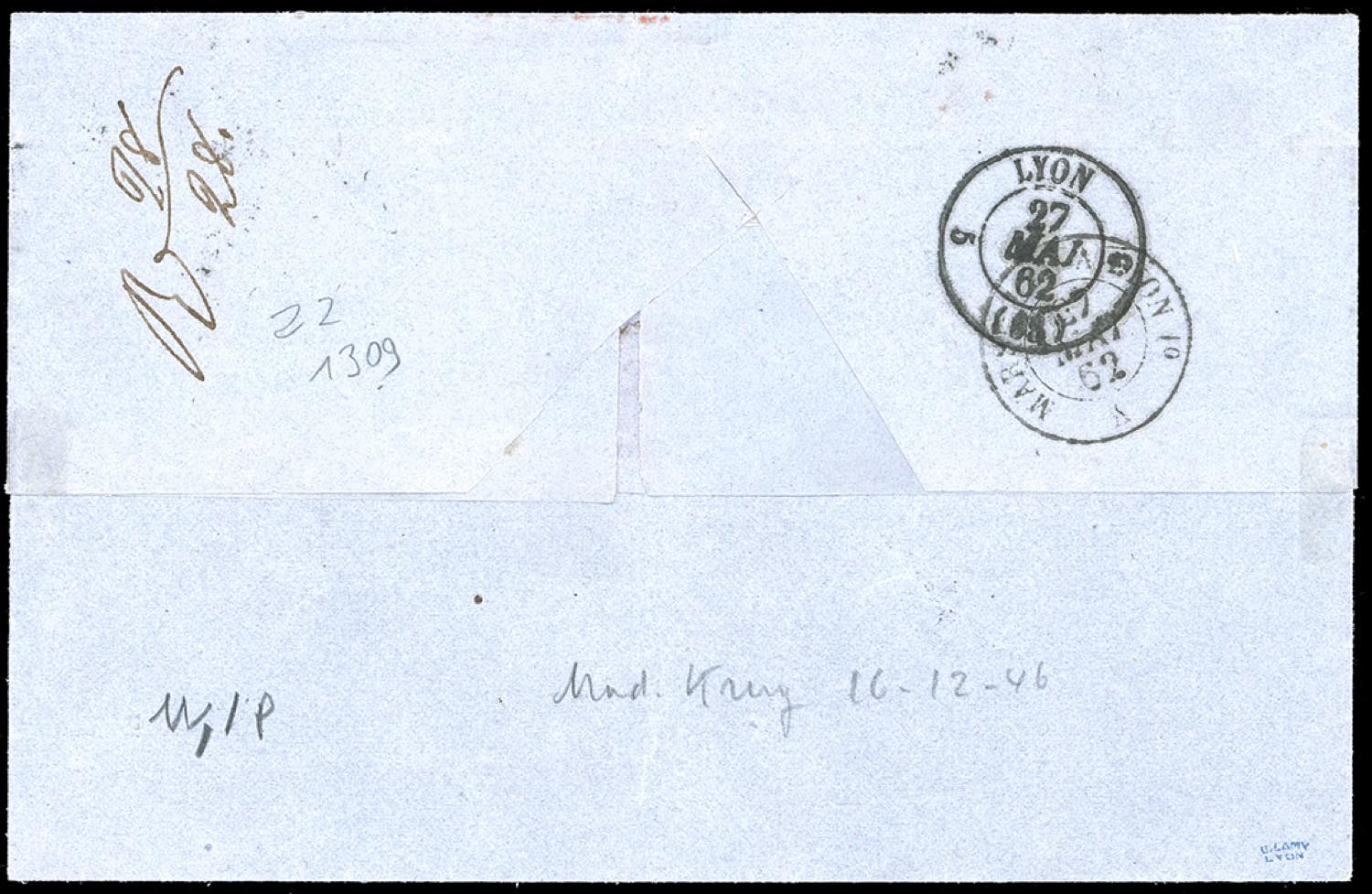 1862 - 10 grana giallo arancio, falso per posta, II tipo, effigie C (F8a), perfetto, su lettera da Napoli 24/5/1862 per Lione, Francia, ... Read more