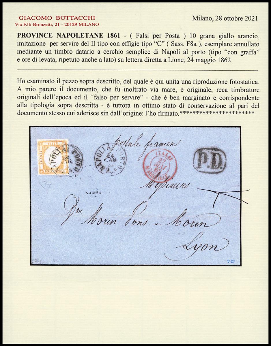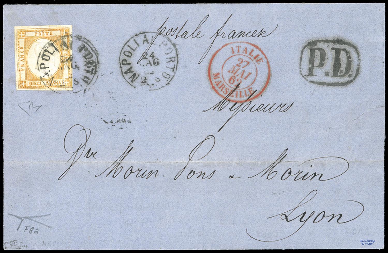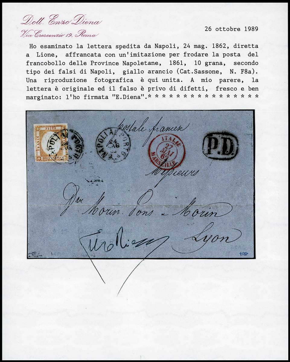 1862 - 10 grana giallo arancio, falso per posta, II tipo, effigie C (F8a), perfetto, su lettera da Napoli 24/5/1862 per Lione, Francia, manoscritto sul fronte "postale francese". Molto bella. Cert. E.Diena e Bottacchi.