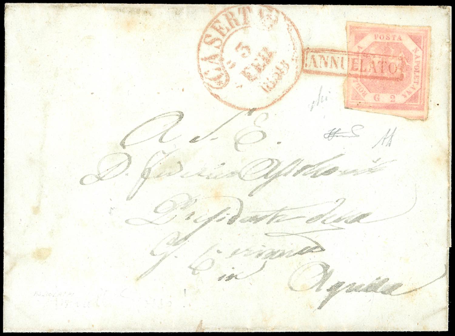 CASERTA, annullato + cerchio rossi punti 13 - 2 grana (5a), perfetto, su lettera del 3/2/1858 per L'Aquila. Rara. A.Diena, Ferrario, cert. Avi.