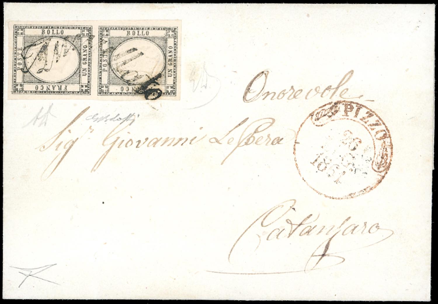 PIZZO, svolazzo + cerchio rosso punti R1 - 1 grano nero grigiastro (19), coppia verticale, perfetta e ben marginata, su fresca sovracoperta di lettera del 26/7/1861 a Catanzaro. Bella e rara. Em. e A.Diena, Bolaffi, cert. Bottacchi.