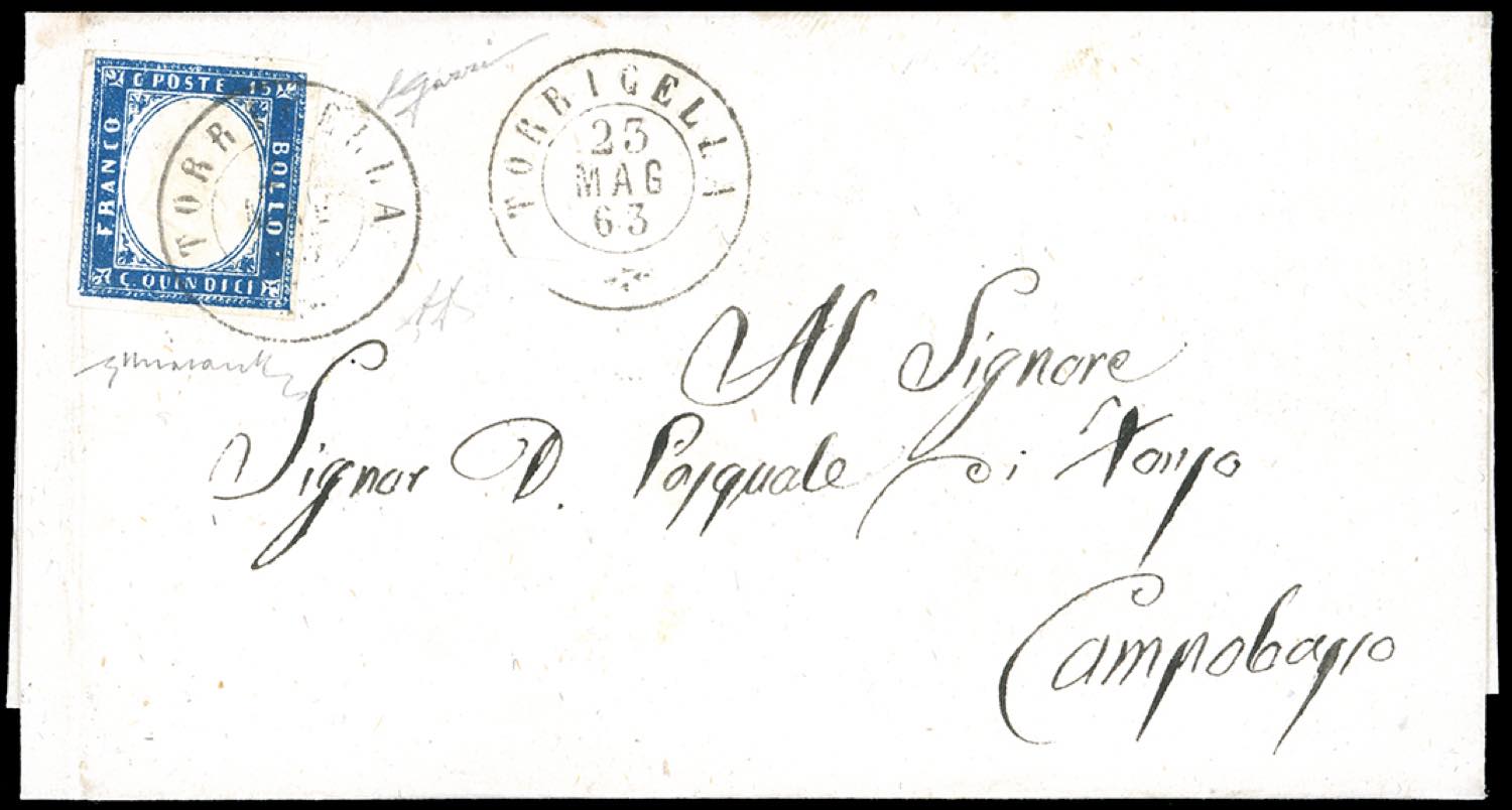 TORRICELLA, sardo italiano punti 9 - 15 cent. tipo Sardegna (Regno 11), perfetto, su fresca lettera del 23/5/1863 a Campobasso. Pregevole ... Read more