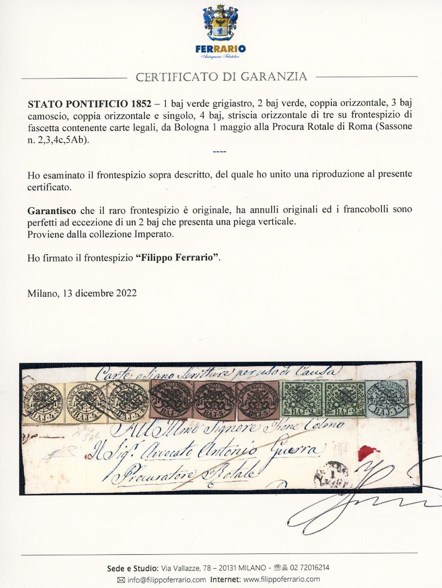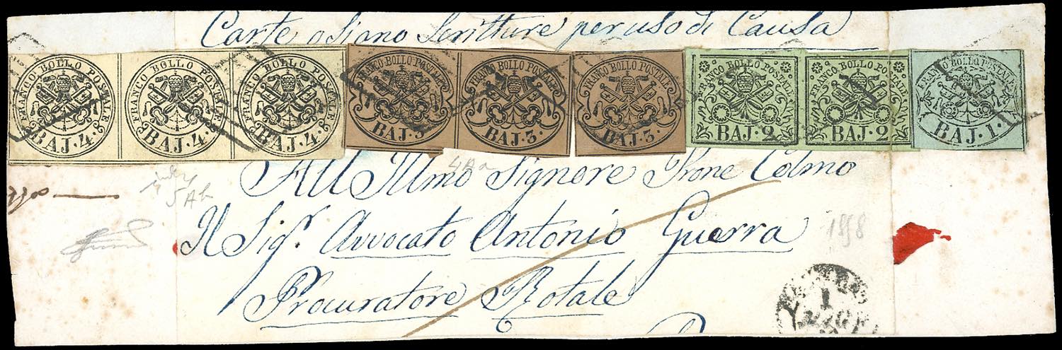 1852 - Frontespizio di fascetta contenente carte legali, con eccezionale affrancatura multipla quadricolore per l'interno da Bologna 1 maggio alla Procura Rotale di Roma, composta da 1 baj, coppia del 2 baj verde, coppia e singolo del 3 baj camoscio e striscia di tre del 4 baj bruno grigio chiaro (2,3,4c,5Ab), tutti perfetti ad eccezione di un 2 baj difettoso. Insieme unico ed estremamente raro. Chiavarello, cert. Ferrario. Ex coll. Imperato.
