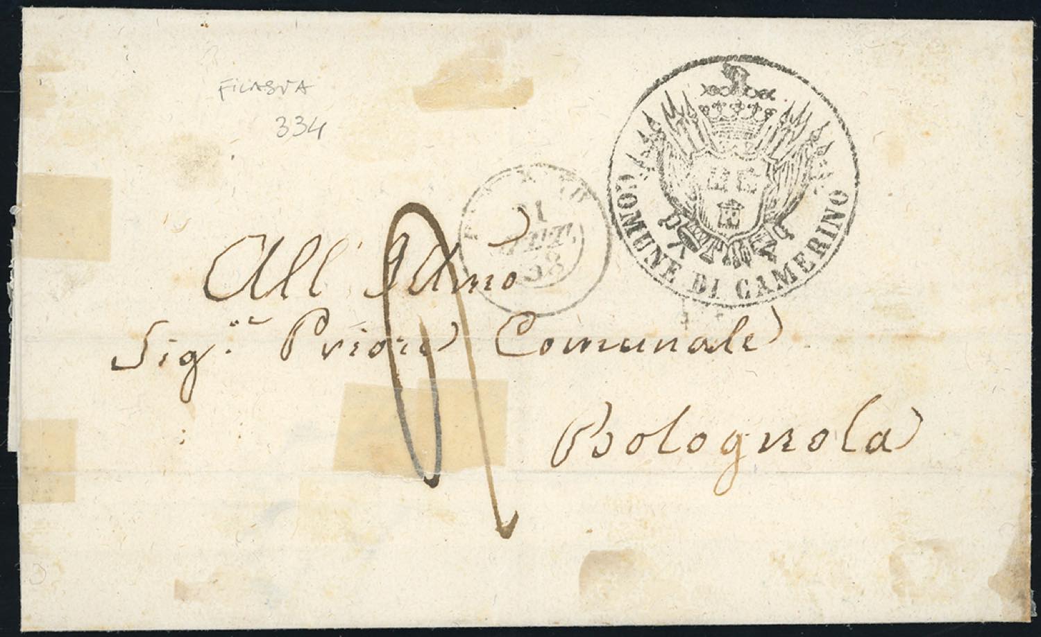 1858 - 4 baj giallo chiaro (5Ab), frazionato diagonalmente a metà, perfetto e ben marginato, al verso di lettera in porto assegnato da Camerino 21/10/1858 a Bolognola, tassata 2. Bella. G.Bolaffi, Mezzadri, cert. E.Diena.