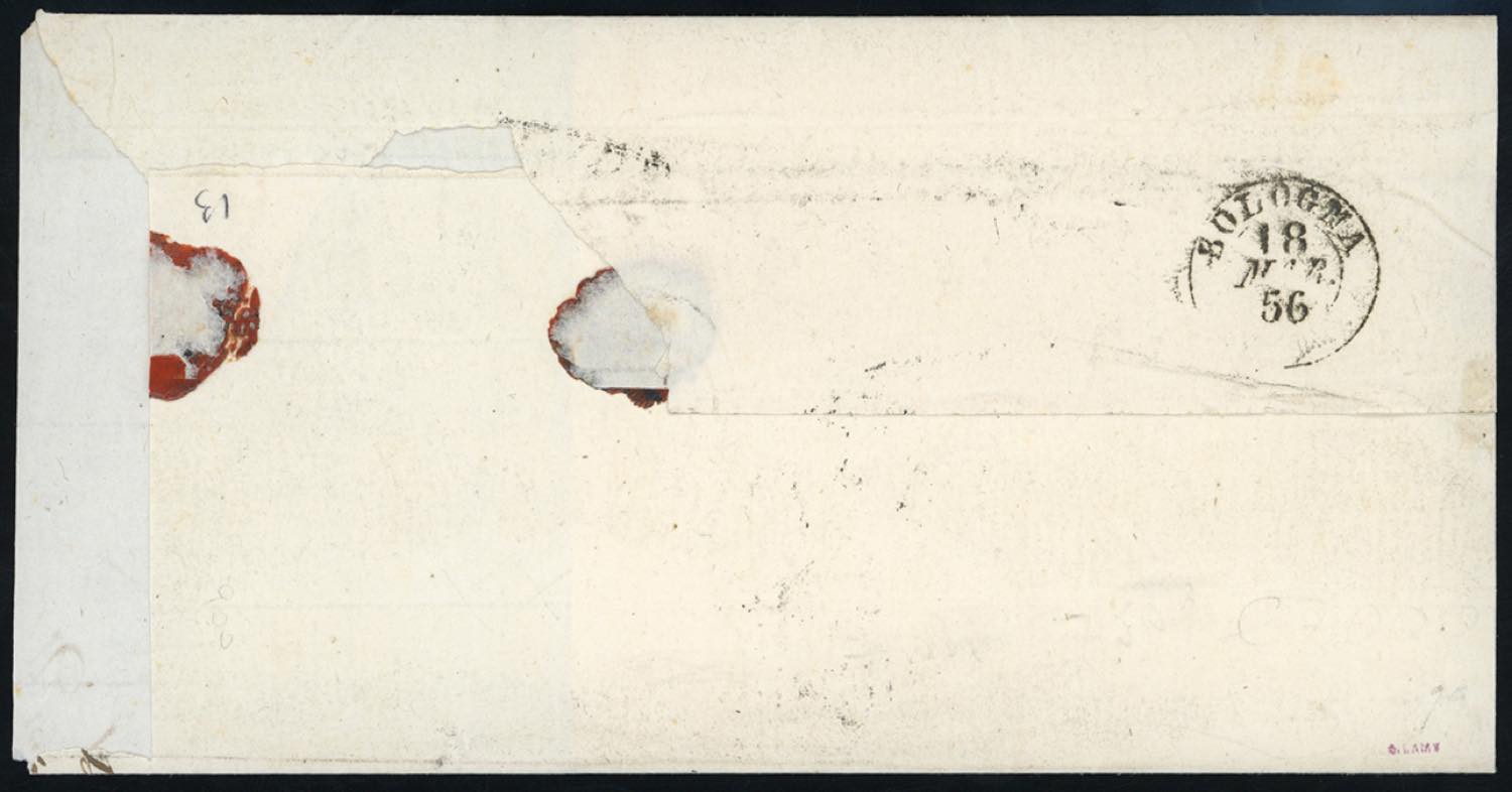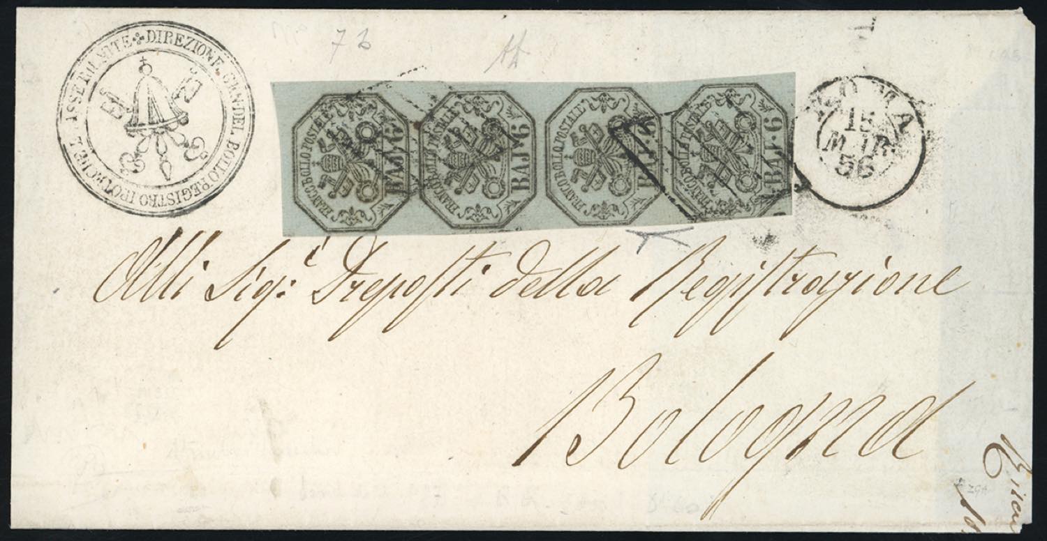1856 - 6 baj grigio verdastro, stampa con inchiostro grigio oleoso (7c), striscia verticale di 4, l'ultimo esemplare intaccato a sinistra, su fresca sovracoperta di lettera da Roma 15/3/1856 a Bologna. Rara e di ottimo aspetto. A.Diena, cert. Bottacchi.